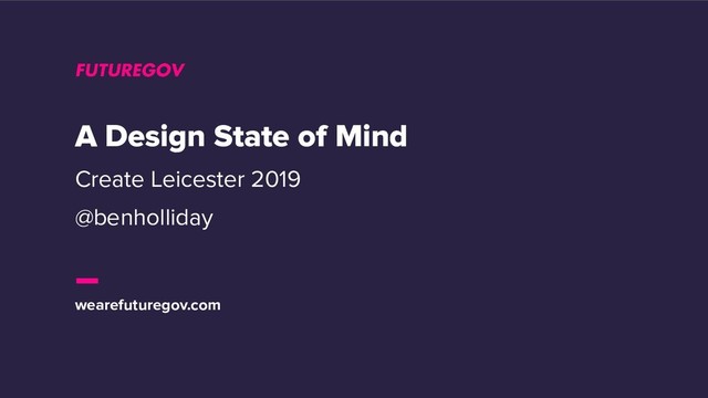In this talk from Create Leicester 2019, Ben Holliday (Chief Design Officer at FutureGov) introduced how to think differently about how we use design as a way of responding and shaping the change happening all around us, exploring how creativity needs to be a capability and the foundation for how 21st Century organisations work.