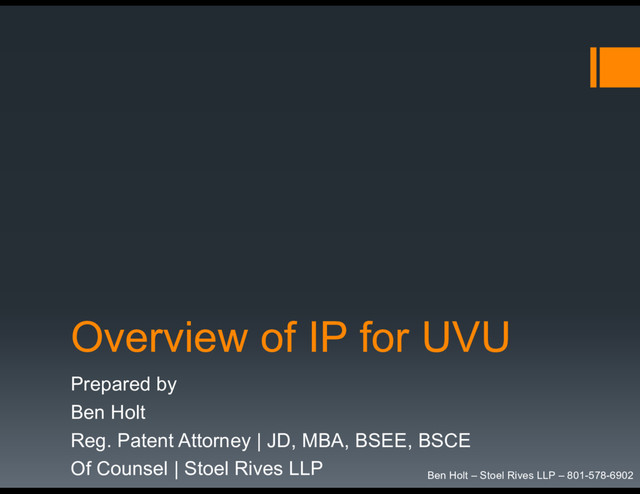 A walkthrough of Intellectual Property (IP) for business students studying MBA 6910.001 Designing Business at Utah Valley University and how to leverage IP for their business effectively.