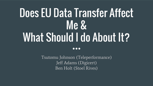 State Surveillance ◦ Judical Redress • Regulator Fines Going to Go Up ◦ Now a Few $100k to Much Higher • Other Countries With Data Protection Laws Similar to EU ◦ Israel - Followed Suit Already? ◦ Dubai • Judicial Redress Act