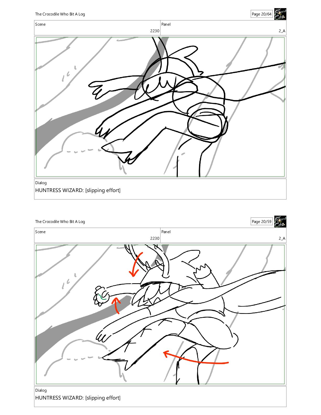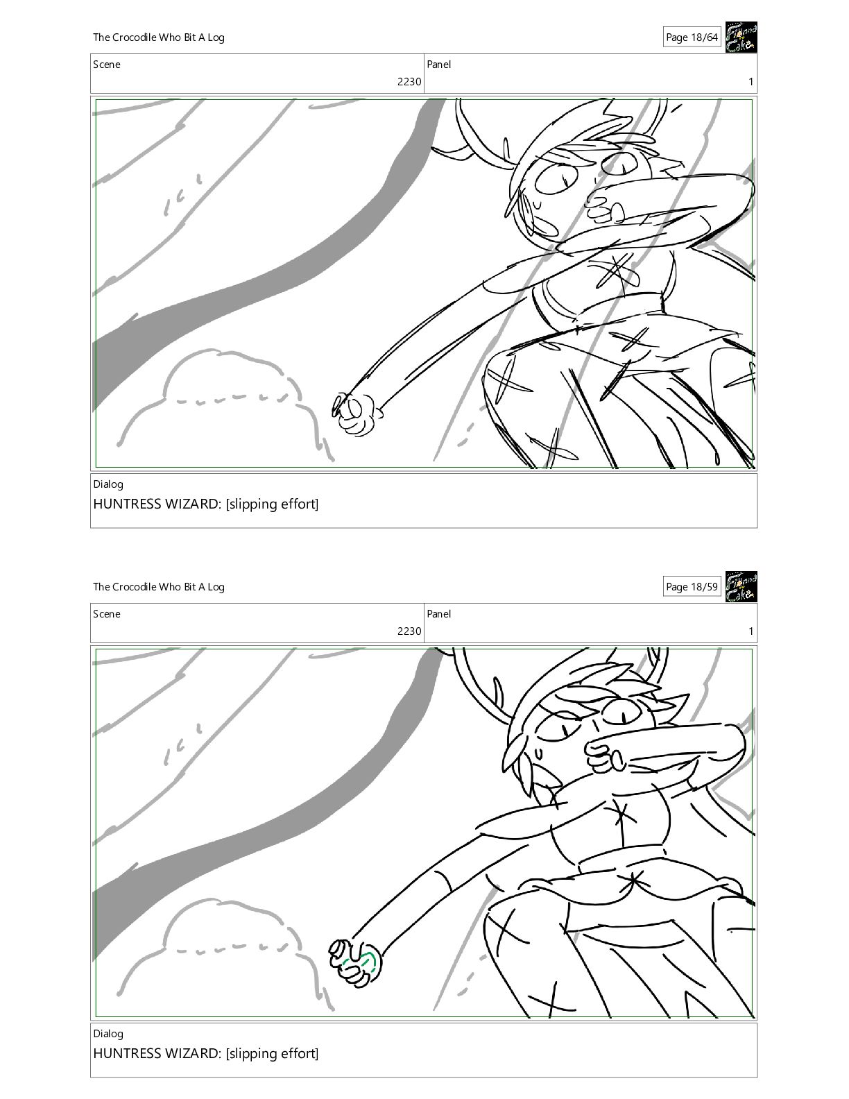 Crocodile Who Bit A Log Page 18/64 Scene 2230 Panel 1 Dialog HUNTRESS WIZARD: [slipping effort] The Crocodile Who Bit A Log Page 18/59