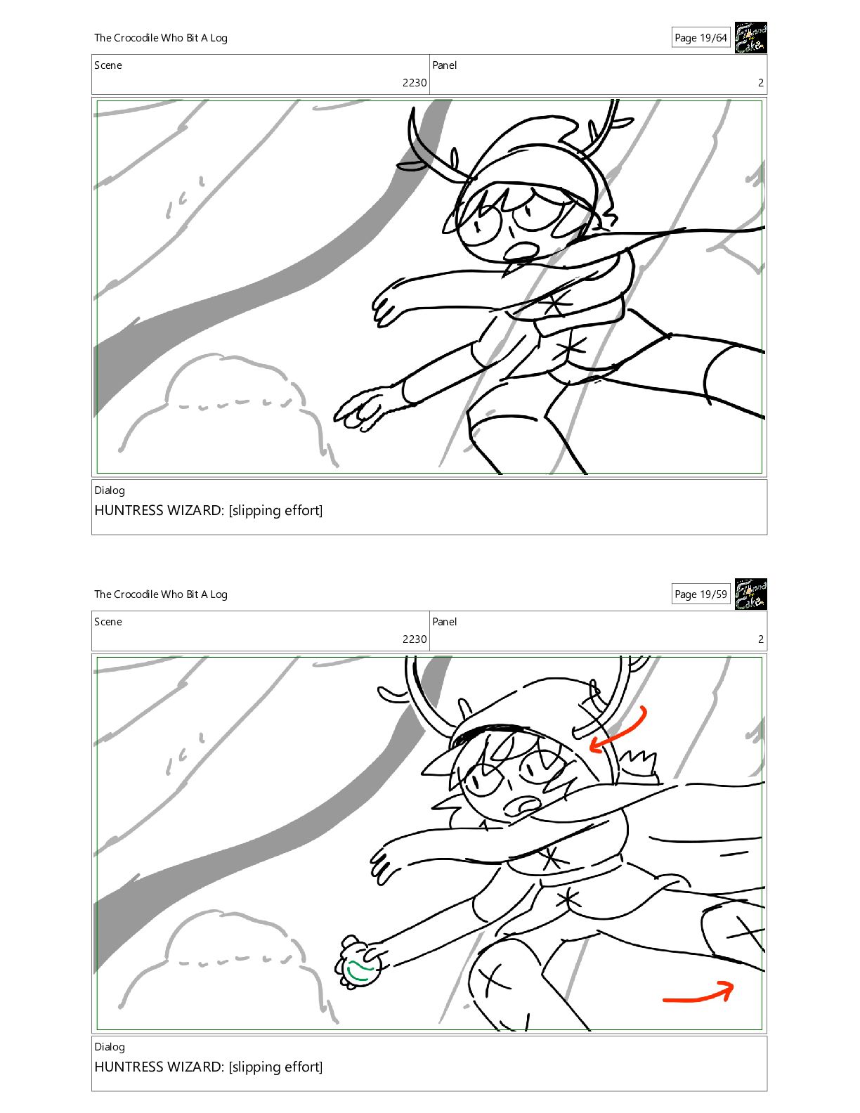 Crocodile Who Bit A Log Page 19/64 Scene 2230 Panel 2 Dialog HUNTRESS WIZARD: [slipping effort] The Crocodile Who Bit A Log Page 19/59