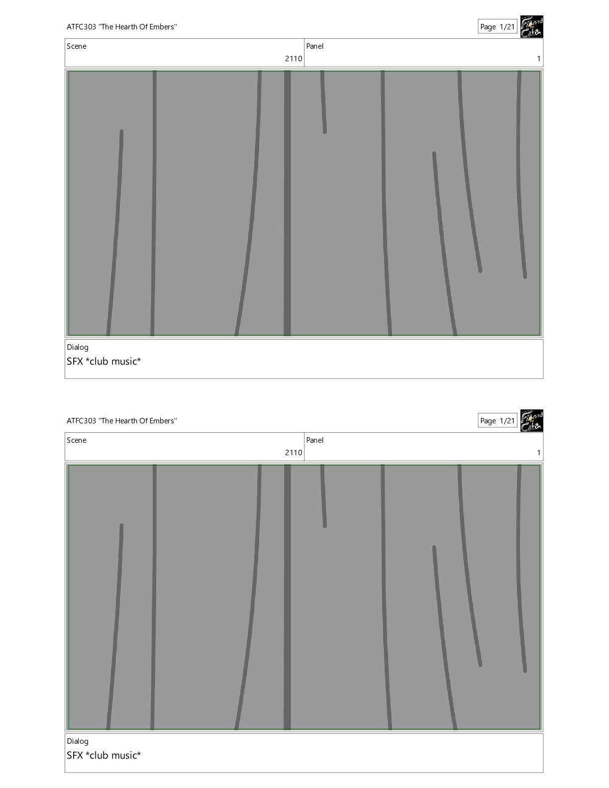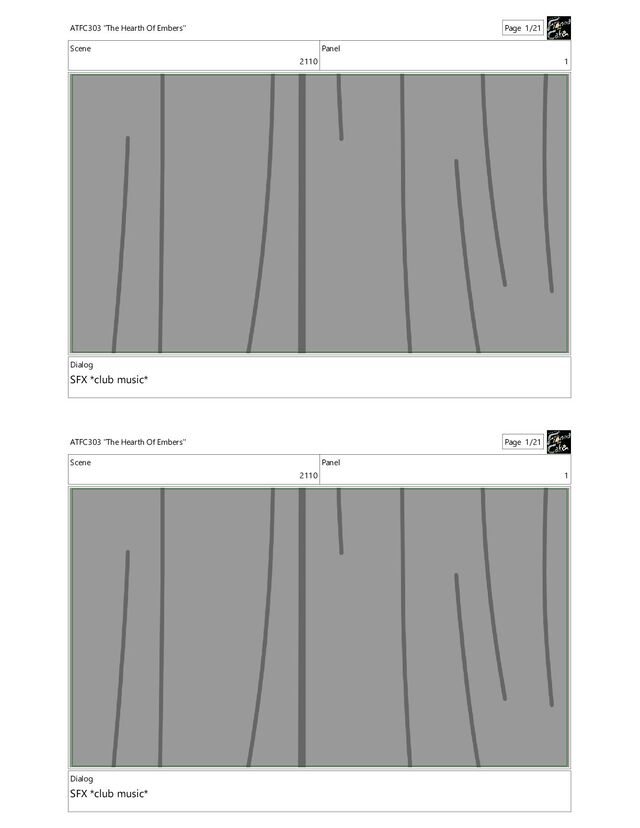 Hearth Of Embers" Page 1/21 Scene 2110 Panel 1 Dialog SFX *club music* ATFC303 "The Hearth Of Embers" Page 1/21