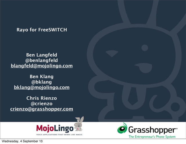 by Chris Rienzo with the sponsorship of Grasshopper 6 Voice App Punchblock AMI FreeSWITCH Logging Plugins Statistics SQL Web Service REST/JSON/XML Carrier APIs Wednesday, 4 September 13