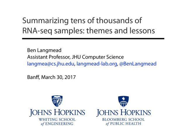 Abstract: The Sequence Read Archive contains RNA-seq data for over 450K samples, including over 140K from humans. Large-scale projects like GTEx and ICGC are generating RNA-seq data on many thousands of samples. Such huge datasets are valuable, but unwieldy for typical researchers. I will describe work toward the goal of making it easy for researchers to use the archived RNA-seq data available today. I will highlight Rail-RNA (http://rail.bio), its dbGaP-protected version (http://docs.rail.bio/dbgap/), as well as the recount resource (https://jhubiostatistics.shinyapps.io/recount/) and Snaptron service/API (http://snaptron.cs.jhu.edu). Besides showcasing these tools and resources, I'll expound three themes: (a) pulic data is valuable but not easy to use and computationalists should attack this; (b) scalability is not just about scaling software to be distributed & multi-threaded, but is also about making the best use of many datasets at once; (c) "strategically unplugging" from gene annotations can lead to clearer statements about splicing and differential expression.