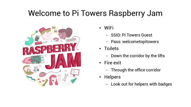Pi Towers Guest – Pass: welcometopitowers • Toilets – Down the corridor by the lifts • Fire exit – Through the office corridor • Helpers – Look out for helpers with badges
