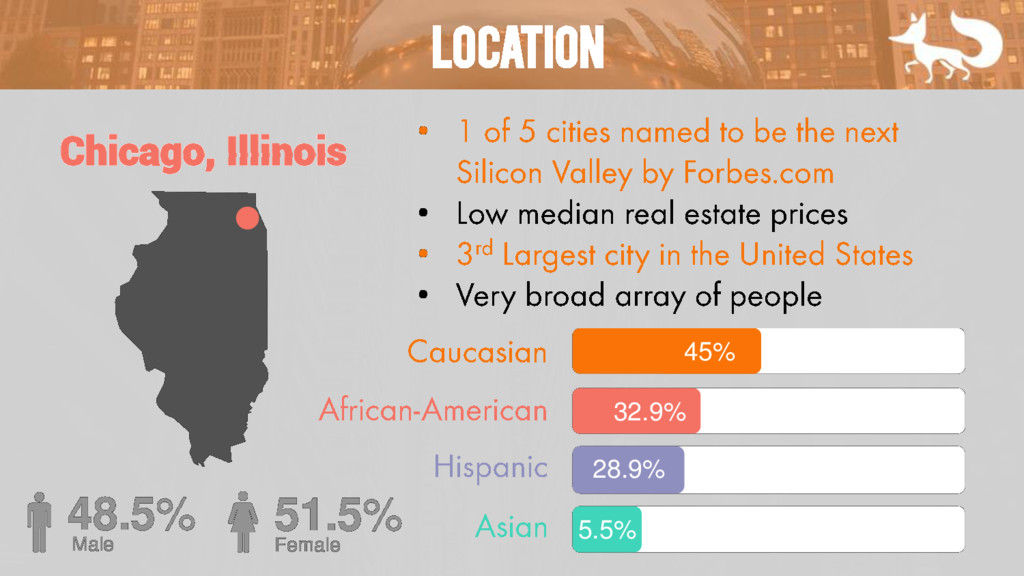 Chicago, Illinois 28.9% 32.9% 51.5% Female 48.5% Male 45% 5.5%