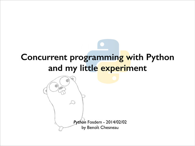 ) ! def sum(a, c): s = 0 for v in a: s += v c.send(s) ! @maintask def main(): a = [7, 2, 8, -9, 4, 0] ! c = makechan() go(sum, a[:int(len(a)/2)], c) go(sum, a[int(len(a)/2):], c) x, y = c.recv(), c.recv() ! print(x, y, x+y) ! if __name__ == "__main__": run() package main ! import "fmt" ! func sum(a []int, c chan int) { sum := 0 for _, v := range a { sum += v } c <- sum // send sum to c } ! func main() { a := []int{7, 2, 8, -9, 4, 0} ! c := make(chan int) go sum(a[:len(a)/2], c) go sum(a[len(a)/2:], c) x, y := <-c, <-c // receive from c ! fmt.Println(x, y, x+y) } Python Go