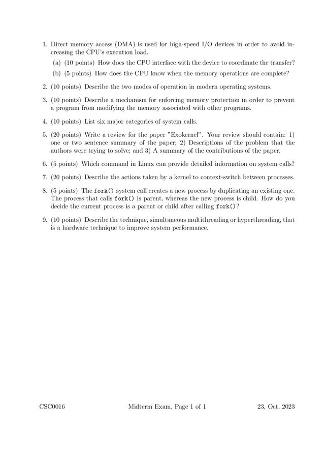 devices in order to avoid in- creasing the CPU’s execution load. (a) (10 points) How does the CPU interface with the device to coordinate the transfer? (b) (5 points) How does the CPU know when the memory operations are complete? 2. (10 points) Describe the two modes of operation in modern operating systems. 3. (10 points) Describe a mechanism for enforcing memory protection in order to prevent a program from modifying the memory associated with other programs. 4. (10 points) List six major categories of system calls. 5. (20 points) Write a review for the paper ”Exokernel”. Your review should contain: 1) one or two sentence summary of the paper; 2) Descriptions of the problem that the authors were trying to solve; and 3) A summary of the contributions of the paper. 6. (5 points) Which command in Linux can provide detailed information on system calls? 7. (20 points) Describe the actions taken by a kernel to context-switch between processes. 8. (5 points) The fork() system call creates a new process by duplicating an existing one. The process that calls fork() is parent, whereas the new process is child. How do you decide the current process is a parent or child after calling fork()? 9. (10 points) Describe the technique, simultaneous multithreading or hyperthreading, that is a hardware technique to improve system performance. CSC0016 Midterm Exam, Page 1 of 1 23, Oct, 2023