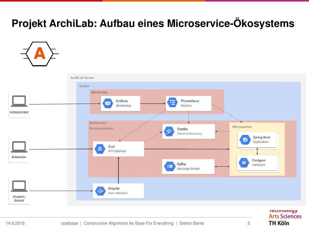 For Everything | Stefan Bente 14.9.2018 4 Basis-Plattform Server, Basis-Hostingdienste, Netzwerk IT-Applikations-Ökosystem (Microservice-basiert) Deployment, Test, Verbindung von Schnittstellen, … Prakti- kums- Börse HOPS … Campus- IT Projekt- Börse … Pingo ILIAS