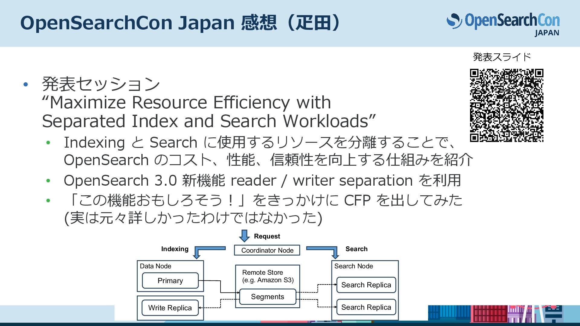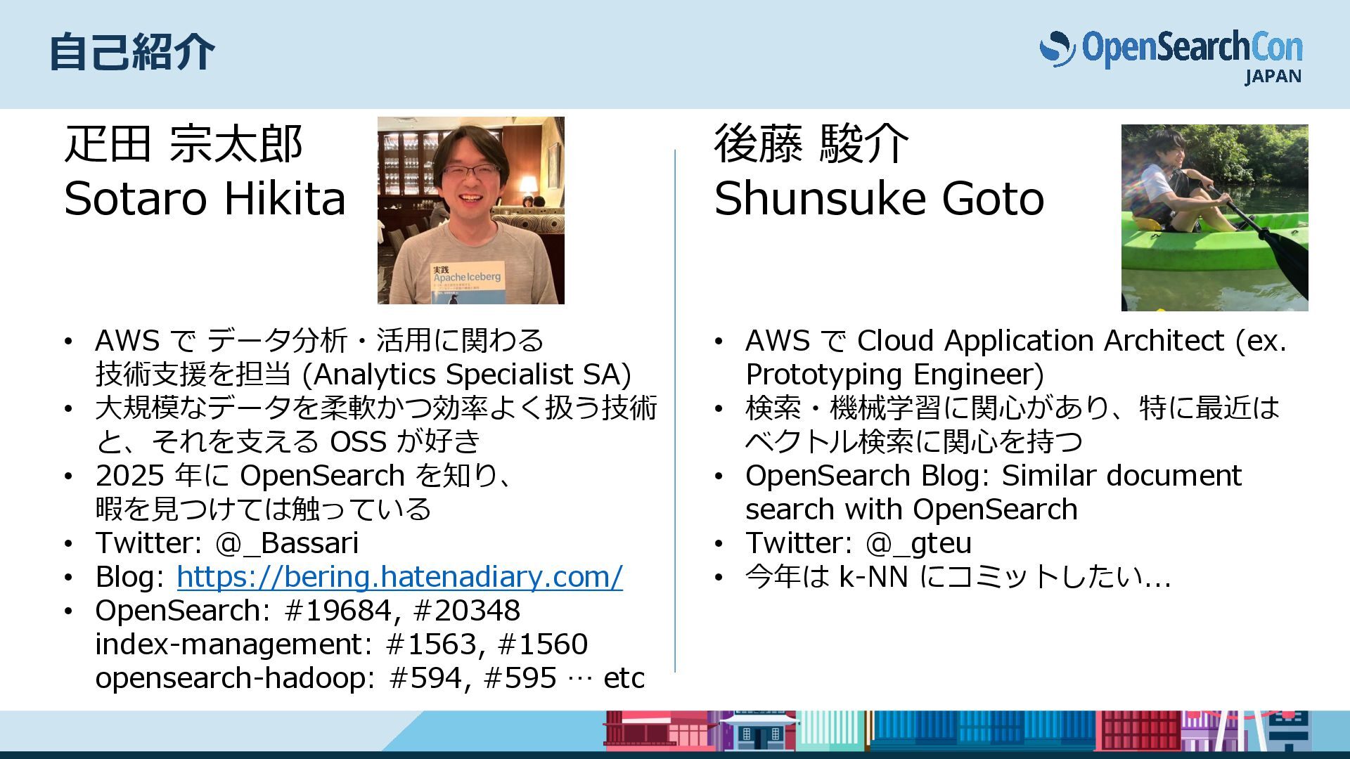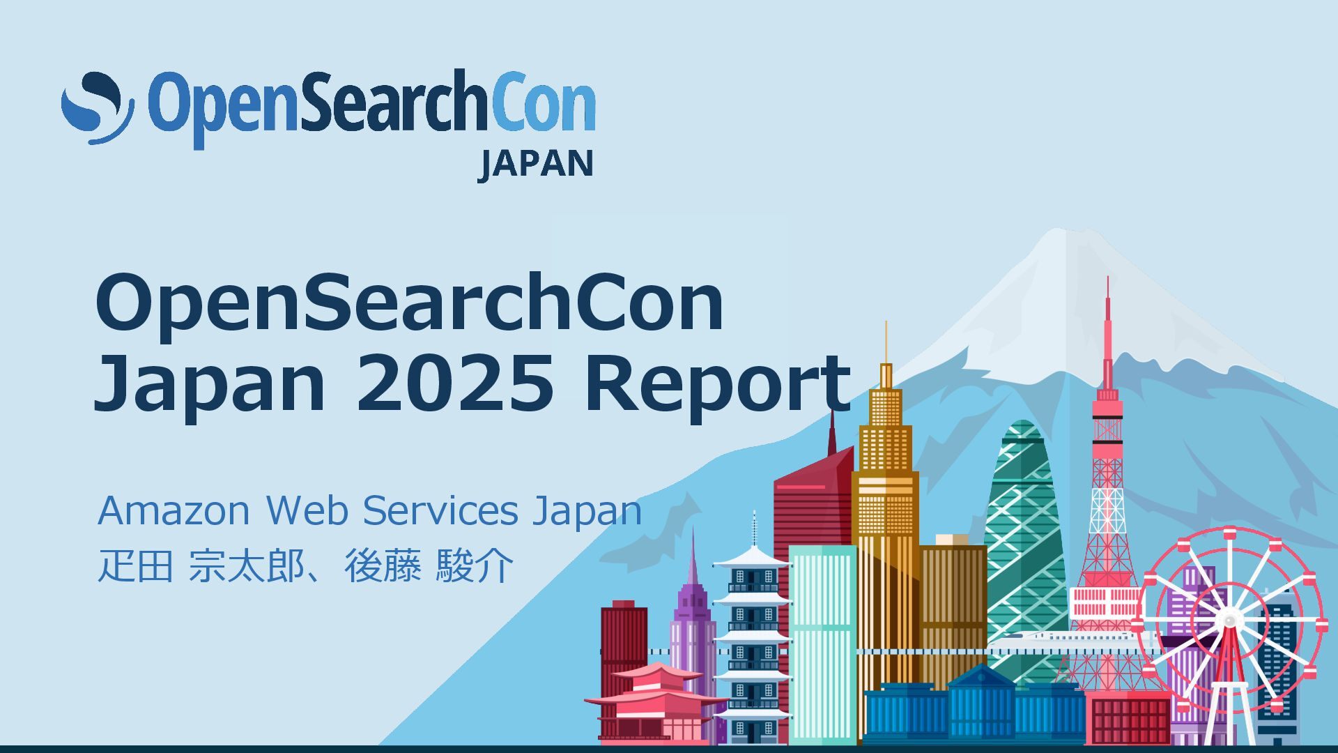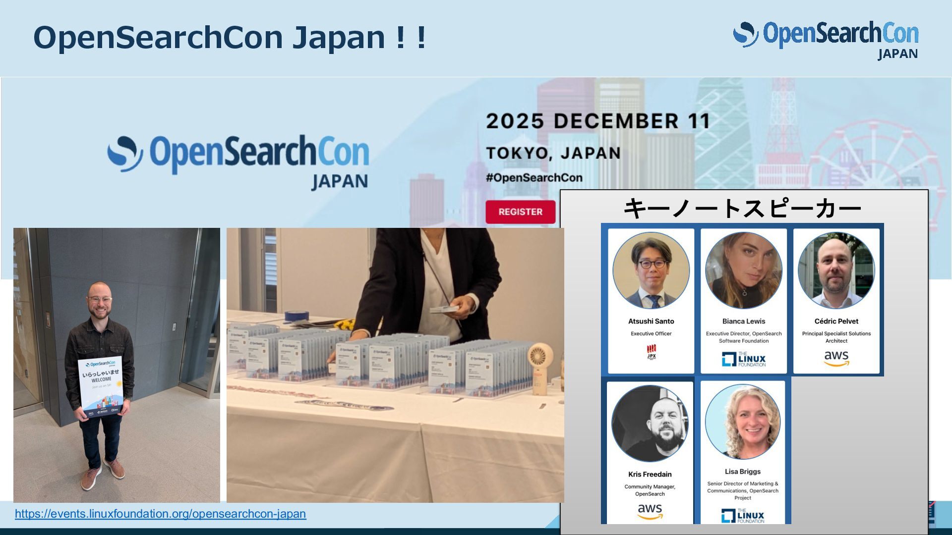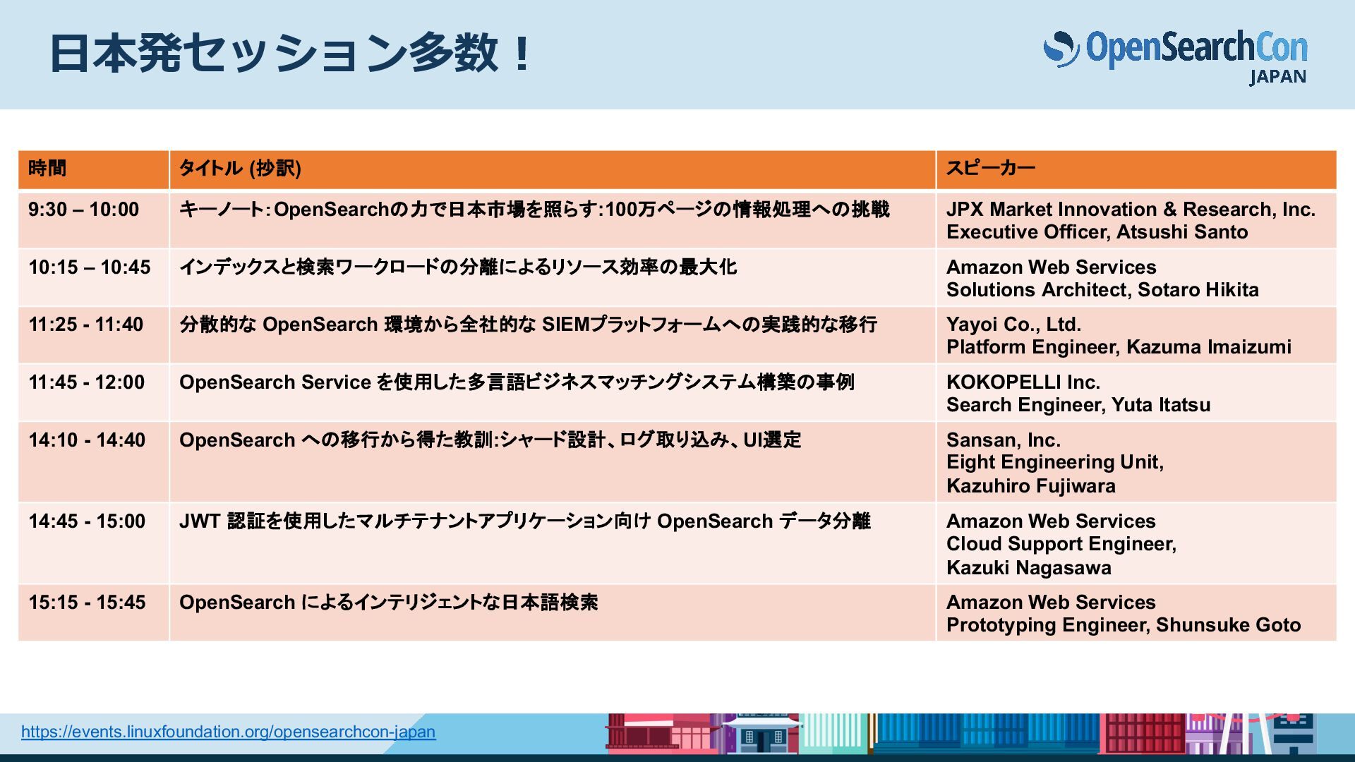 JPX Market Innovation & Research, Inc. Executive Officer, Atsushi Santo 10:15 – 10:45 インデックスと検索ワークロードの分離によるリソース効率の最大化 Amazon Web Services Solutions Architect, Sotaro Hikita 11:25 - 11:40 分散的な OpenSearch 環境から全社的な SIEMプラットフォームへの実践的な移行 Yayoi Co., Ltd. Platform Engineer, Kazuma Imaizumi 11:45 - 12:00 OpenSearch Service を使用した多言語ビジネスマッチングシステム構築の事例 KOKOPELLI Inc. Search Engineer, Yuta Itatsu 14:10 - 14:40 OpenSearch への移行から得た教訓:シャード設計、ログ取り込み、UI選定 Sansan, Inc. Eight Engineering Unit, Kazuhiro Fujiwara 14:45 - 15:00 JWT 認証を使用したマルチテナントアプリケーション向け OpenSearch データ分離 Amazon Web Services Cloud Support Engineer, Kazuki Nagasawa 15:15 - 15:45 OpenSearch によるインテリジェントな日本語検索 Amazon Web Services Prototyping Engineer, Shunsuke Goto