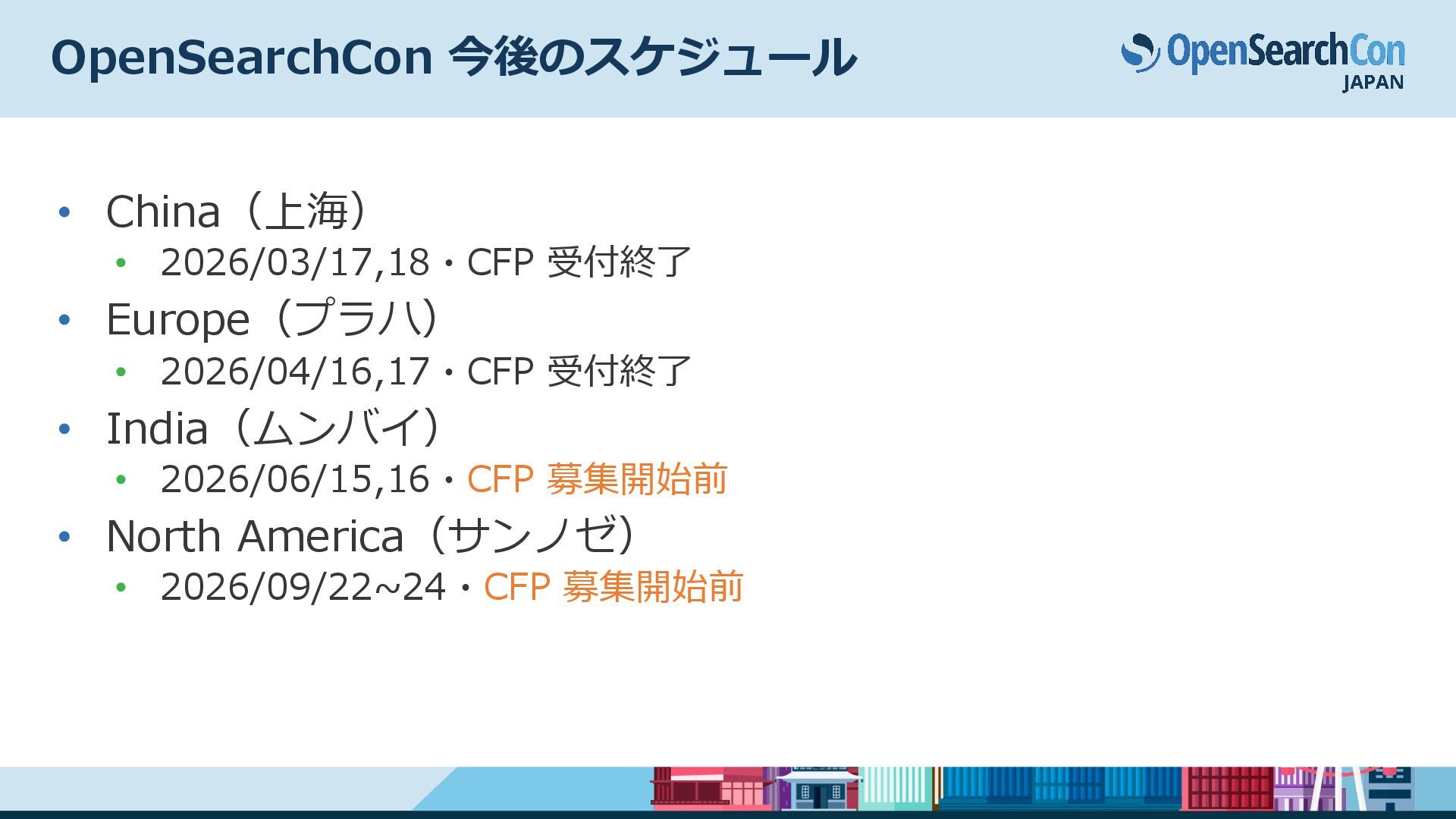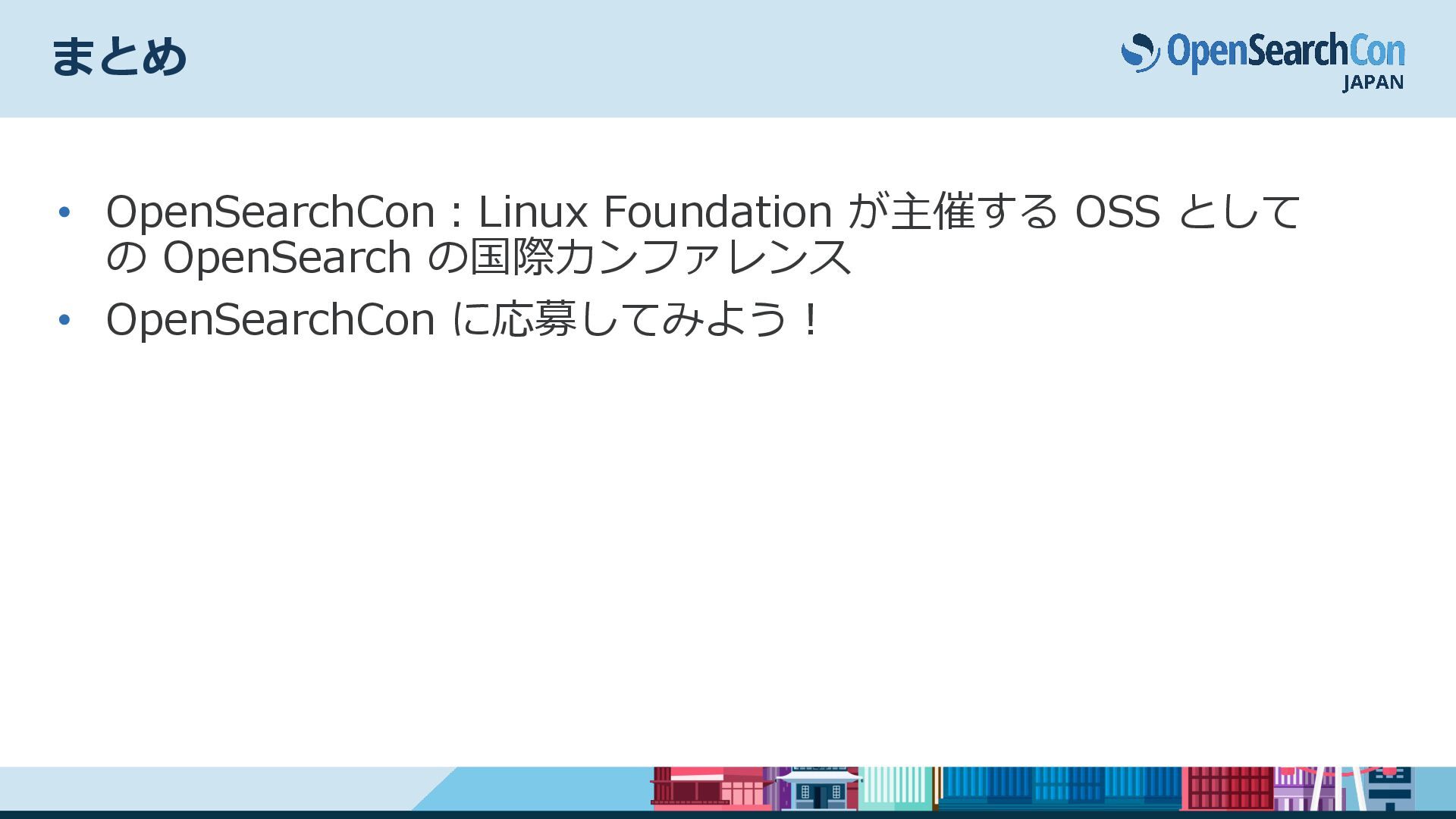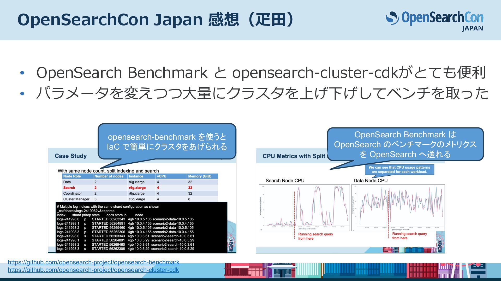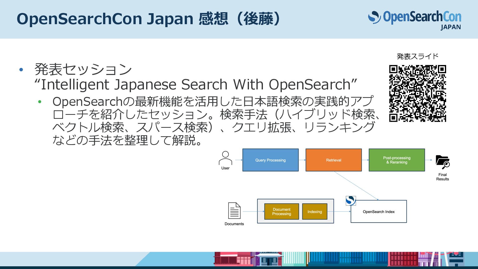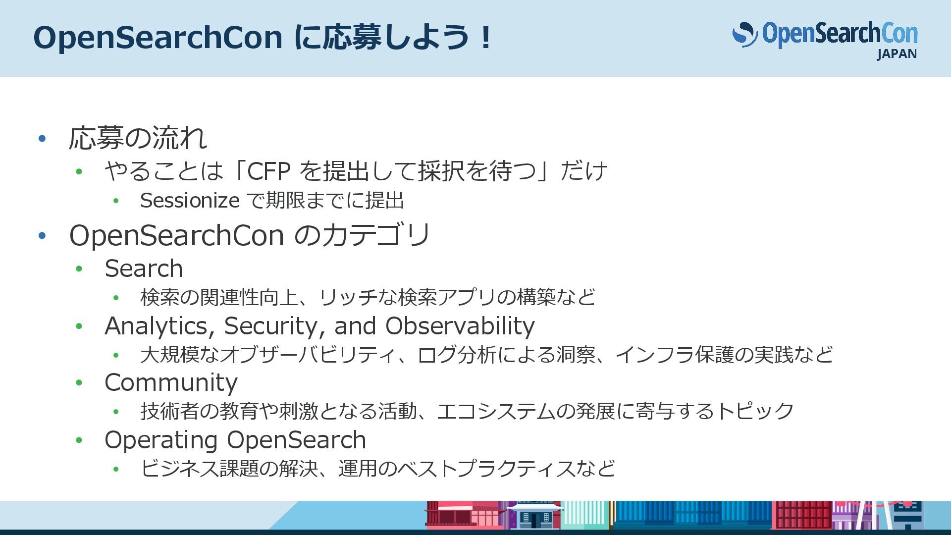 JPX Market Innovation & Research, Inc. Executive Officer, Atsushi Santo 10:15 – 10:45 インデックスと検索ワークロードの分離によるリソース効率の最大化 Amazon Web Services Solutions Architect, Sotaro Hikita 11:25 - 11:40 分散的な OpenSearch 環境から全社的な SIEMプラットフォームへの実践的な移行 Yayoi Co., Ltd. Platform Engineer, Kazuma Imaizumi 11:45 - 12:00 OpenSearch Service を使用した多言語ビジネスマッチングシステム構築の事例 KOKOPELLI Inc. Search Engineer, Yuta Itatsu 14:10 - 14:40 OpenSearch への移行から得た教訓:シャード設計、ログ取り込み、UI選定 Sansan, Inc. Eight Engineering Unit, Kazuhiro Fujiwara 14:45 - 15:00 JWT 認証を使用したマルチテナントアプリケーション向け OpenSearch データ分離 Amazon Web Services Cloud Support Engineer, Kazuki Nagasawa 15:15 - 15:45 OpenSearch によるインテリジェントな日本語検索 Amazon Web Services Prototyping Engineer, Shunsuke Goto