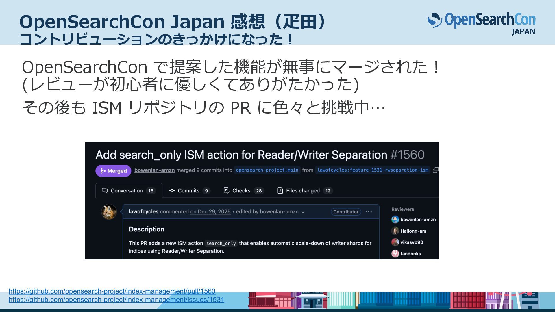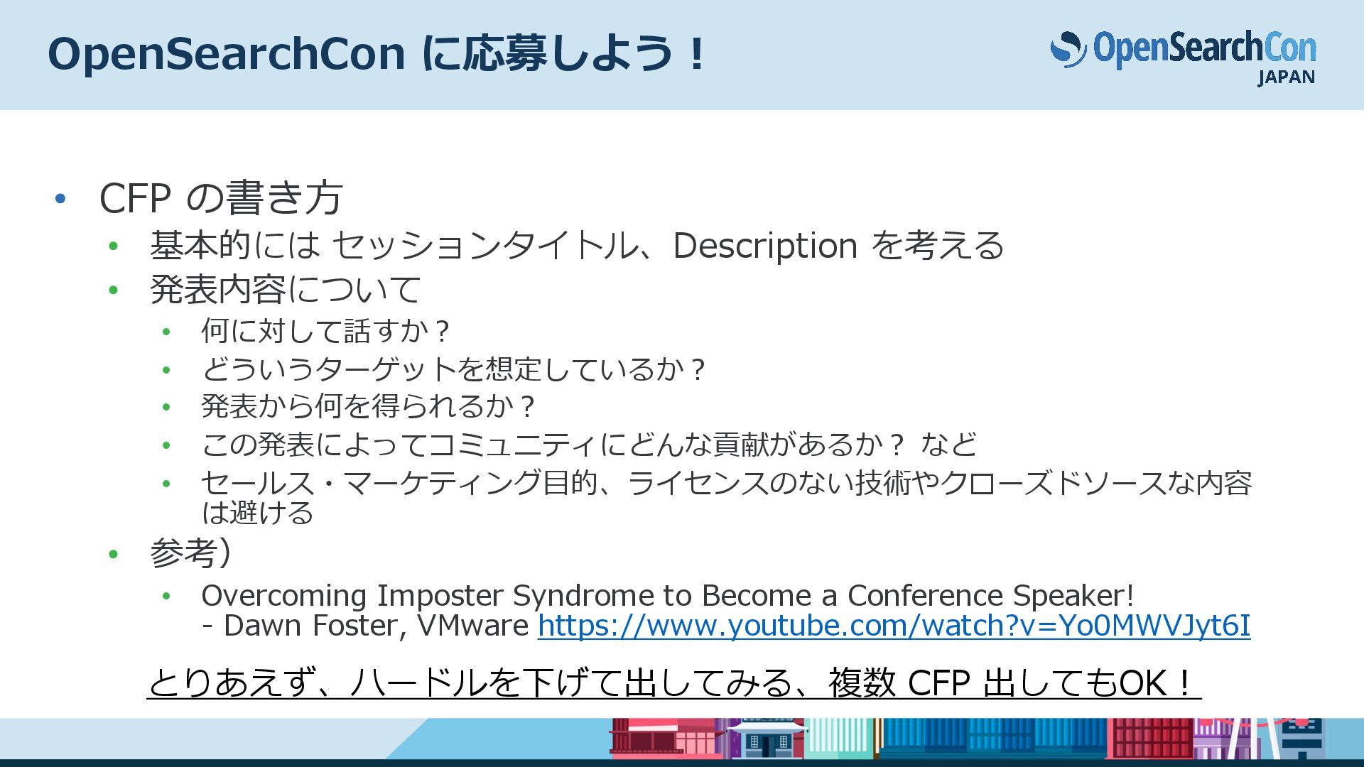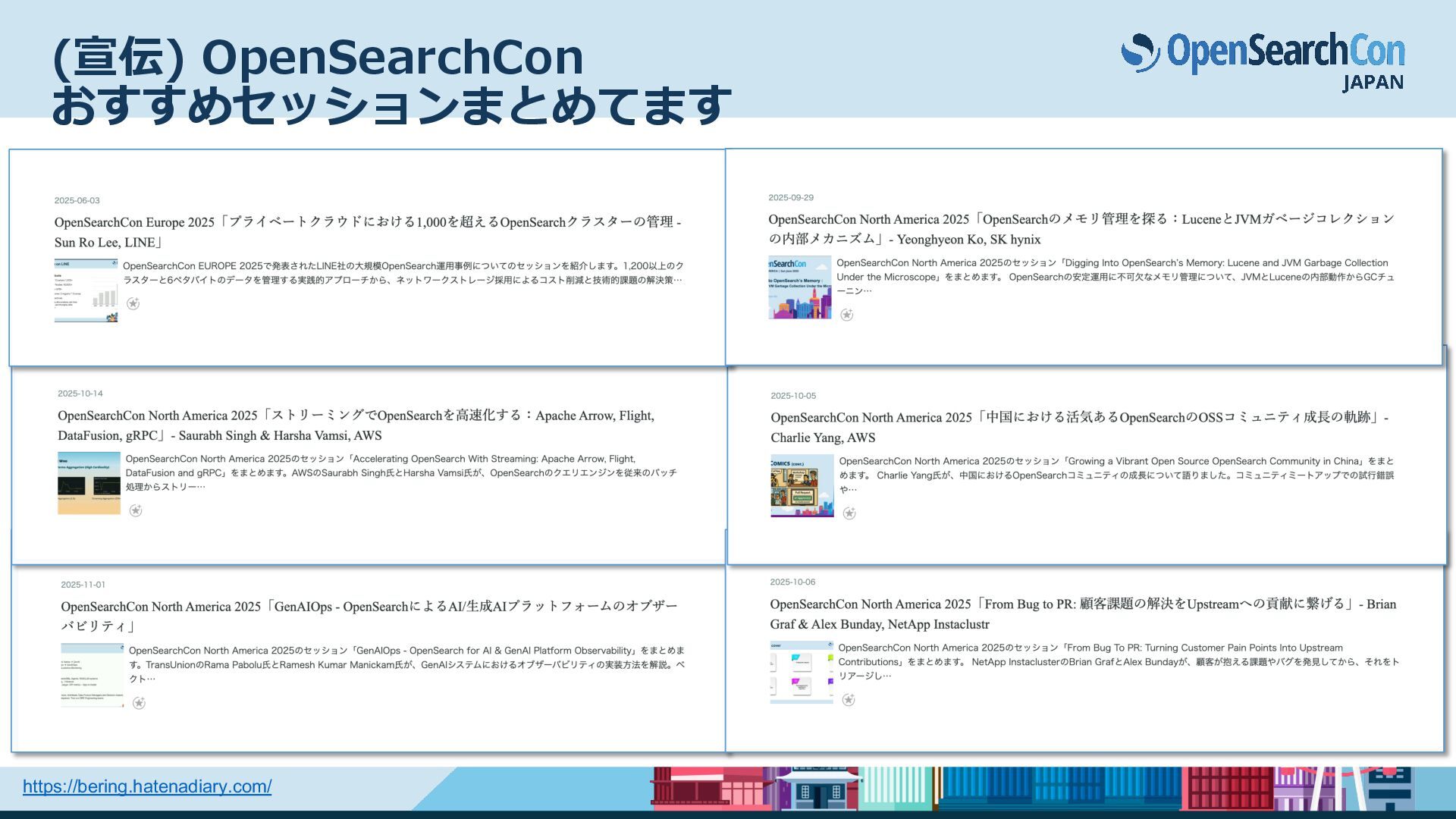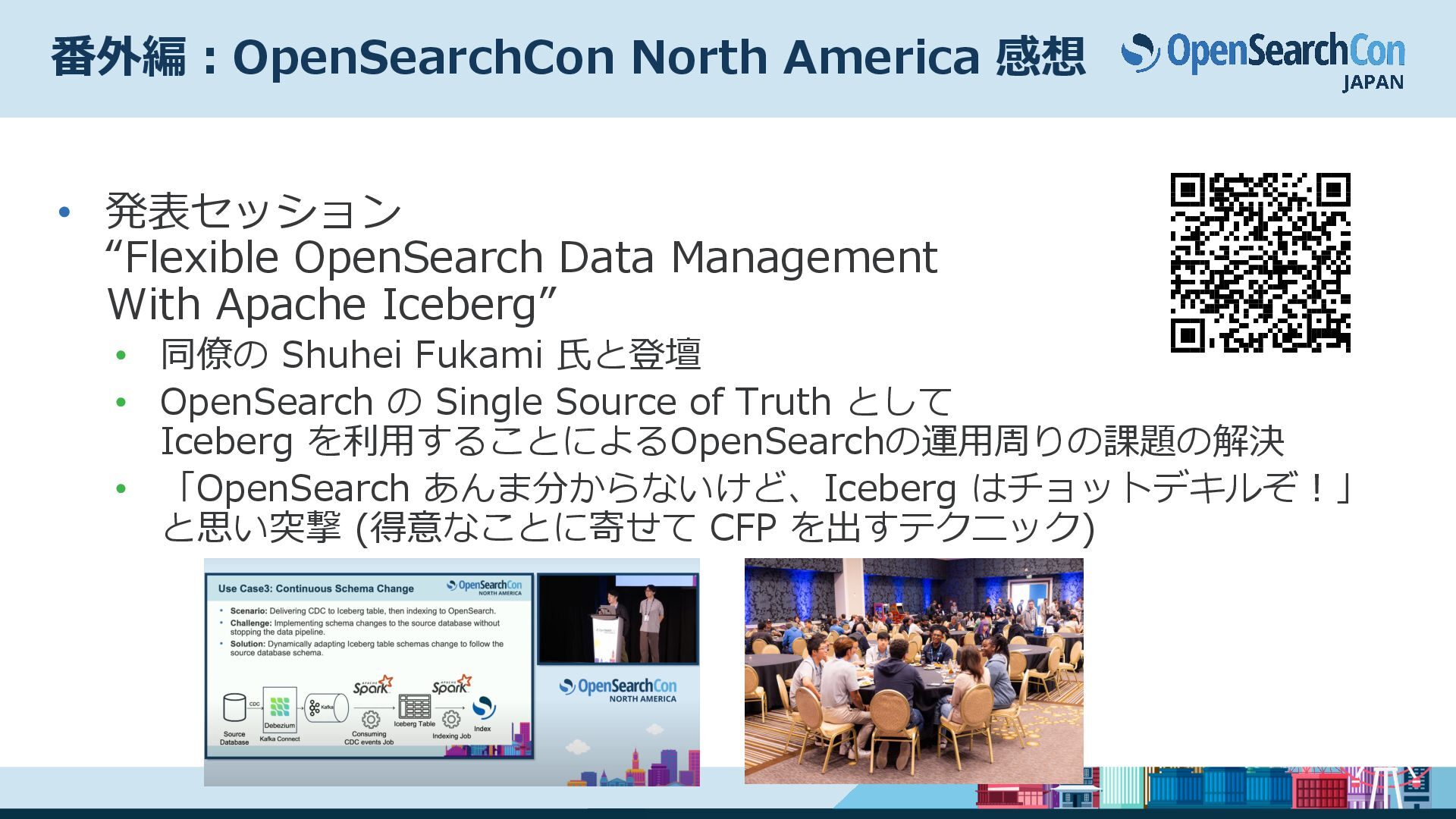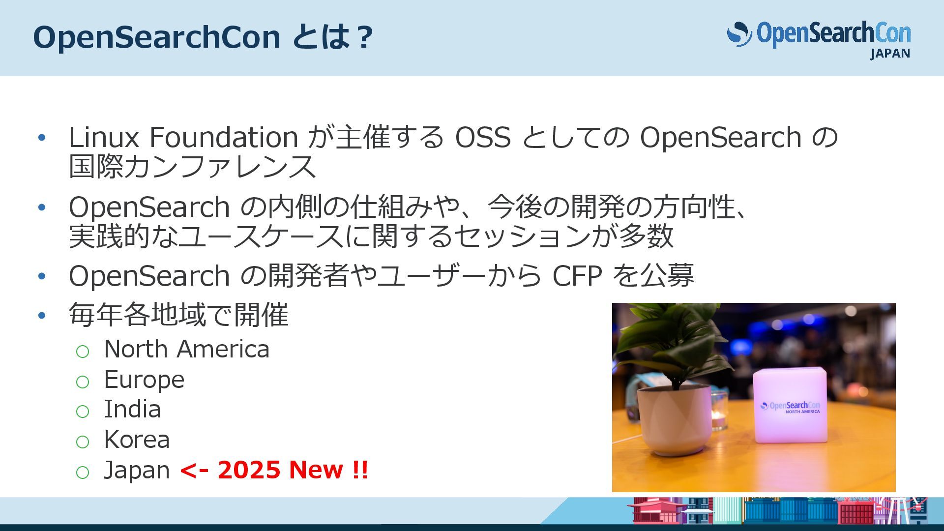 JPX Market Innovation & Research, Inc. Executive Officer, Atsushi Santo 10:15 – 10:45 インデックスと検索ワークロードの分離によるリソース効率の最大化 Amazon Web Services Solutions Architect, Sotaro Hikita 11:25 - 11:40 分散的な OpenSearch 環境から全社的な SIEMプラットフォームへの実践的な移行 Yayoi Co., Ltd. Platform Engineer, Kazuma Imaizumi 11:45 - 12:00 OpenSearch Service を使用した多言語ビジネスマッチングシステム構築の事例 KOKOPELLI Inc. Search Engineer, Yuta Itatsu 14:10 - 14:40 OpenSearch への移行から得た教訓:シャード設計、ログ取り込み、UI選定 Sansan, Inc. Eight Engineering Unit, Kazuhiro Fujiwara 14:45 - 15:00 JWT 認証を使用したマルチテナントアプリケーション向け OpenSearch データ分離 Amazon Web Services Cloud Support Engineer, Kazuki Nagasawa 15:15 - 15:45 OpenSearch によるインテリジェントな日本語検索 Amazon Web Services Prototyping Engineer, Shunsuke Goto