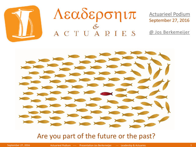 Presentation Jos Berkemeijer --- Leadershp & Actuaries 14 September 27, 2016 is about social & personal change, ethics, attitude & principles, commitment, communication is NOT about • Management • Best expertise • Authority or power • Titles • Having followers is not about YOU, but about OTHERS & YOU