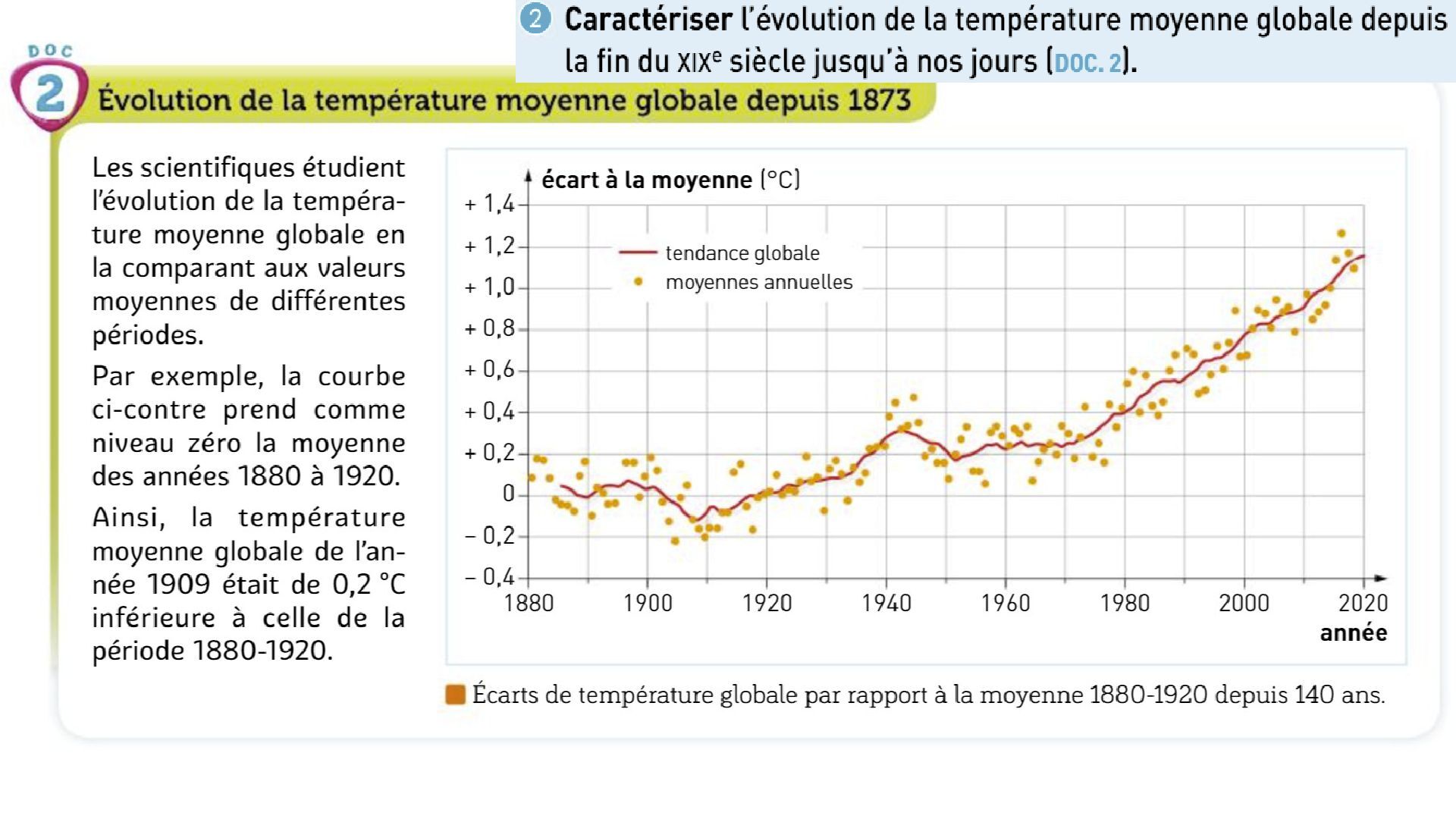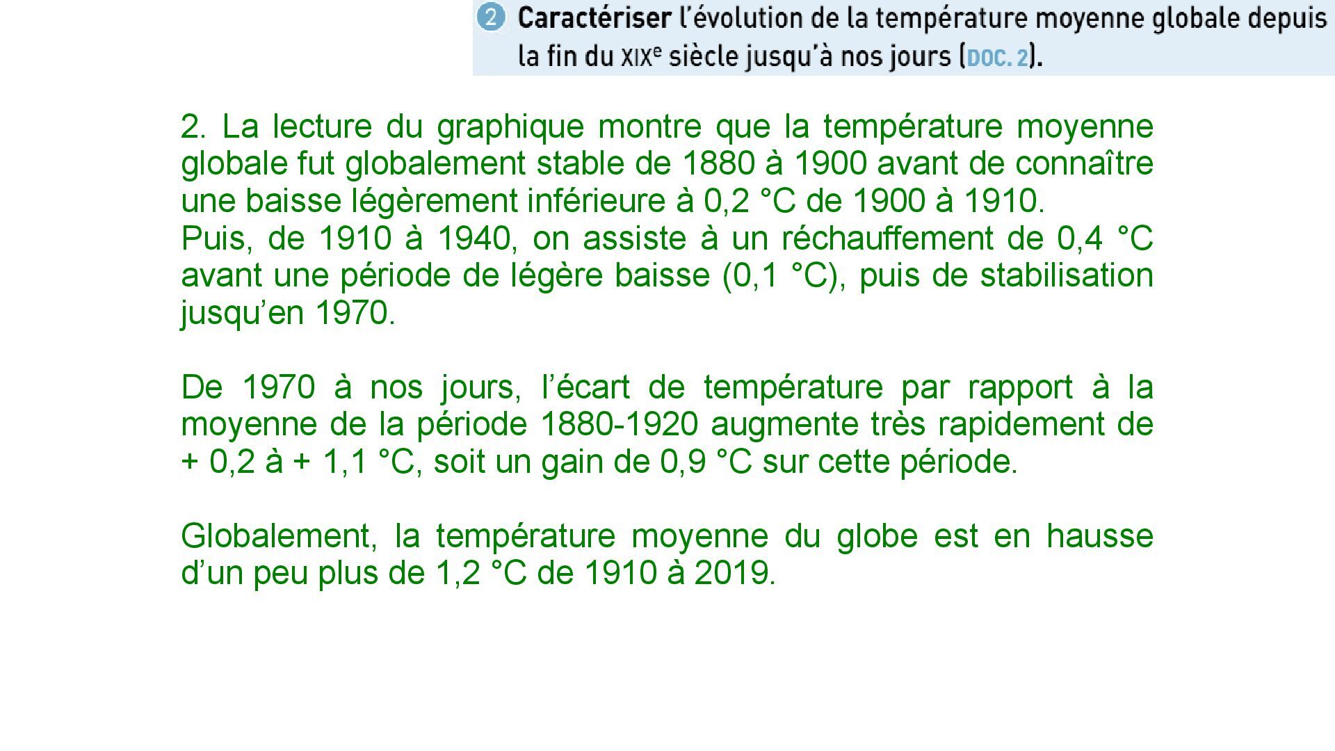 globale fut globalement stable de 1880 à 1900 avant de connaître une baisse légèrement inférieure à 0,2 °C de 1900 à 1910. Puis, de 1910 à 1940, on assiste à un réchauffement de 0,4 °C avant une période de légère baisse (0,1 °C), puis de stabilisation jusqu’en 1970. De 1970 à nos jours, l’écart de température par rapport à la moyenne de la période 1880-1920 augmente très rapidement de + 0,2 à + 1,1 °C, soit un gain de 0,9 °C sur cette période. Globalement, la température moyenne du globe est en hausse d’un peu plus de 1,2 °C de 1910 à 2019.