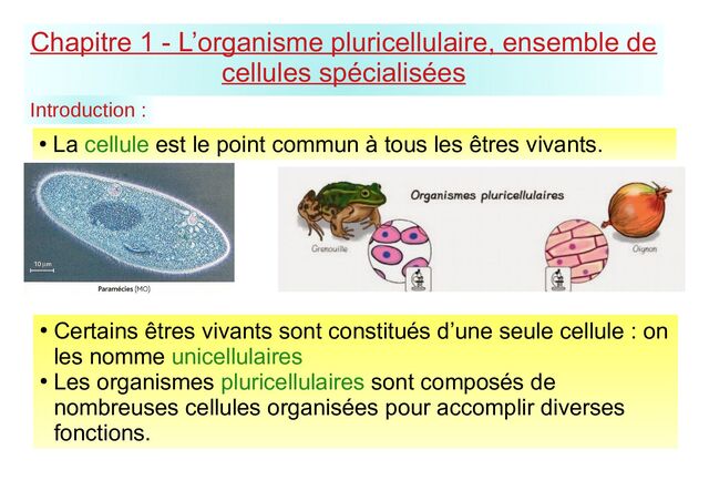 : • La cellule est le point commun à tous les êtres vivants. • Certains êtres vivants sont constitués d’une seule cellule : on les nomme unicellulaires • Les organismes pluricellulaires sont composés de nombreuses cellules organisées pour accomplir diverses fonctions.