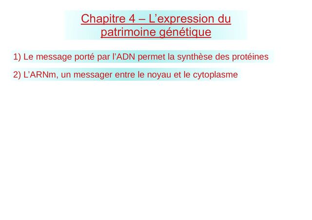 protéines Chapitre 4 – L’expression du patrimoine génétique 2) L’ARNm, un messager entre le noyau et le cytoplasme 3) La synthèse des protéines et la traduction du message génétique