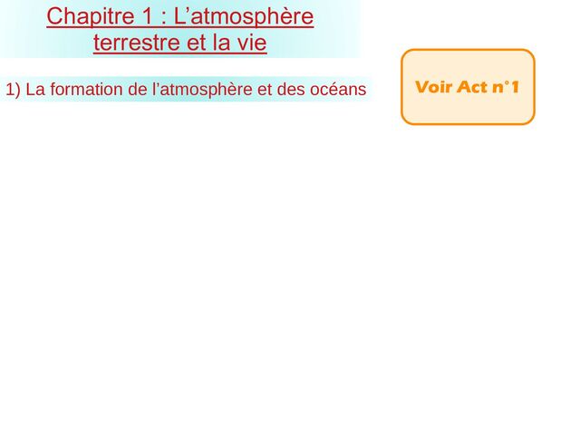 : Vapeur d’eau (83 %) CO 2 (12 %) N 2 (5%) - De -4,45 Ga à -4 Ga - vapeur d’eau disparaît de l’atmosphère - CO 2 (60%) et N 2 (40%) seuls gaz restants - De -4 Ga à -3,5 Ga - Stable - De -3,5 Ga à -1,3 Ga - Disparition CO 2 / Reste N 2 - Lente apparition O 2 depuis -2,2 Ga 3 0 1 2 - De -1,3 Ga à nos jours - Augmentation proportion O 2 à 21 % et stabilisation depuis 400 Ma. 4 1 2 3 4