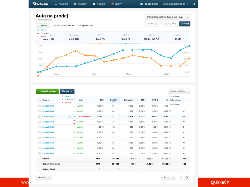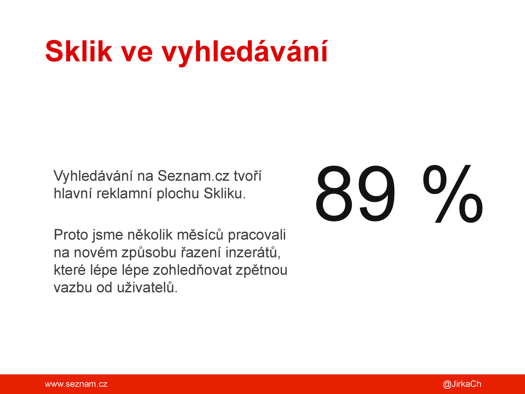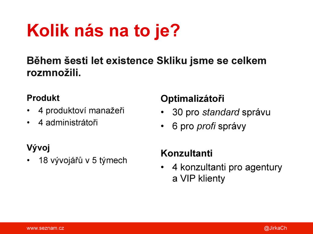 existence Skliku jsme se celkem rozmnožili. Produkt • 4 produktoví manažeři • 4 administrátoři Vývoj • 18 vývojářů v 5 týmech Optimalizátoři • 30 pro standard správu • 6 pro profi správy Konzultanti • 4 konzultanti pro agentury a VIP klienty