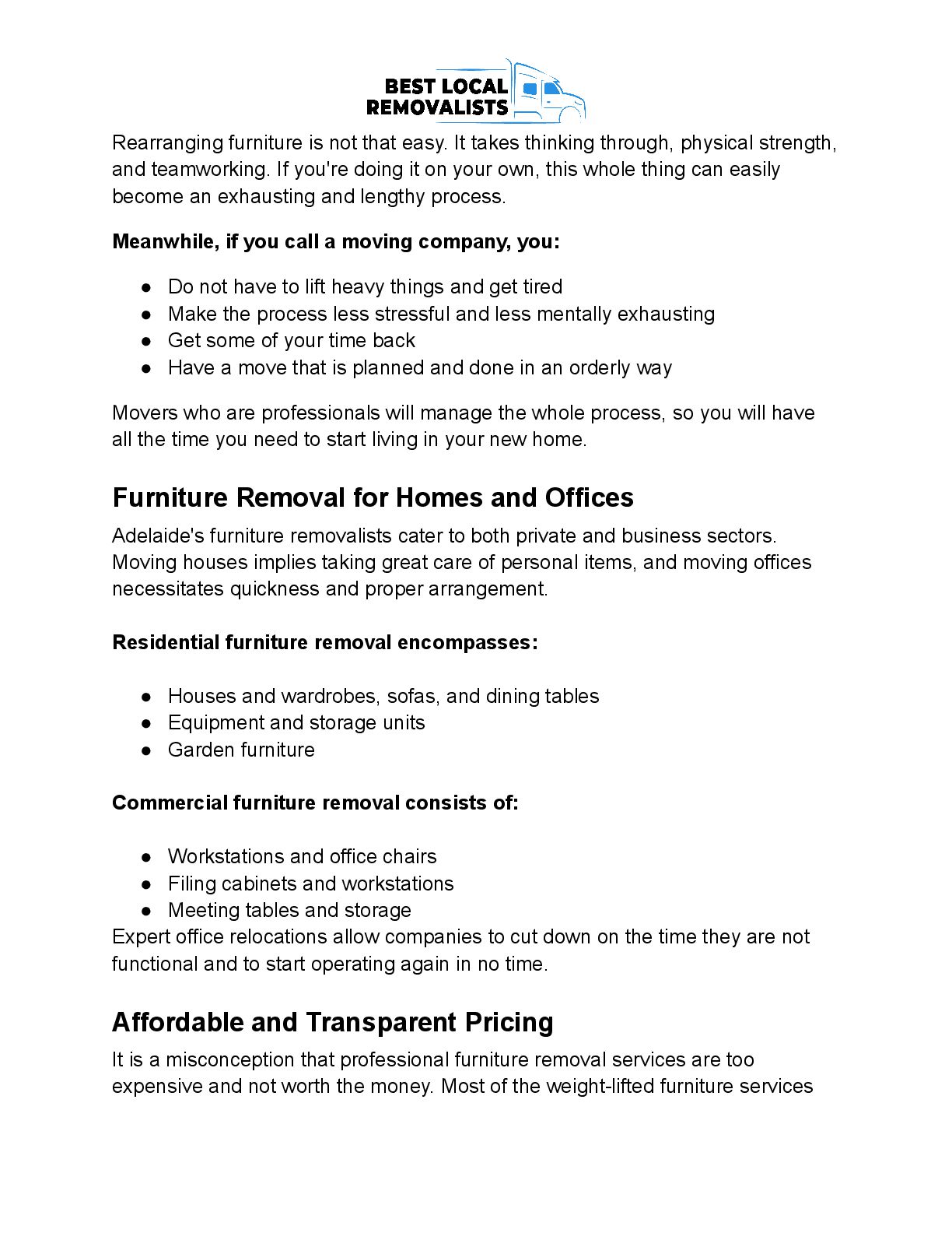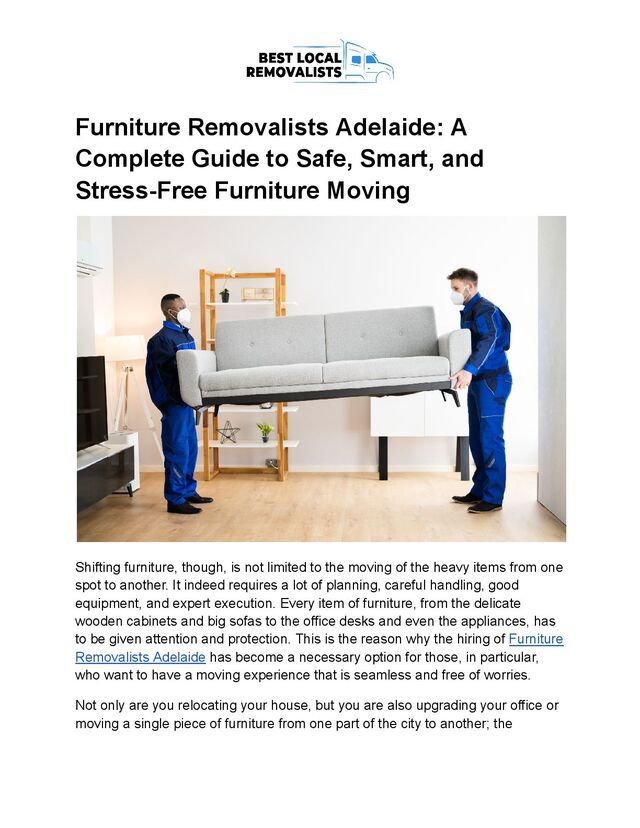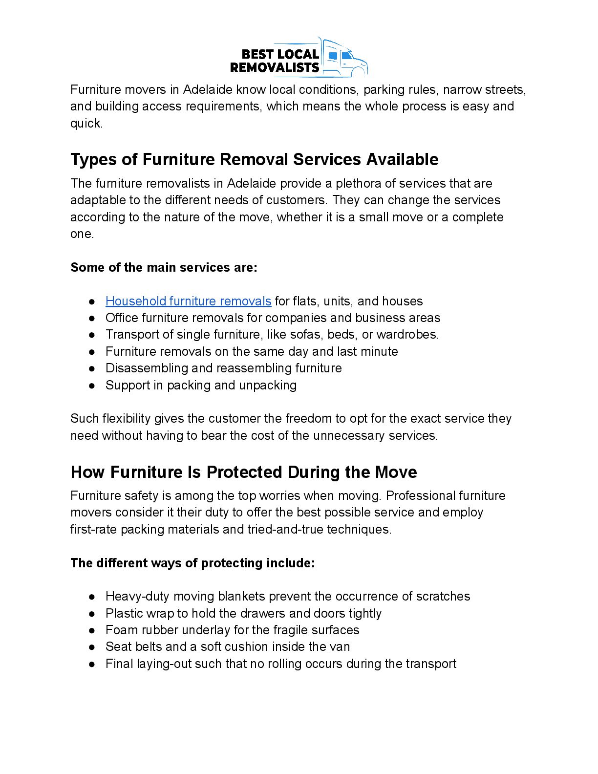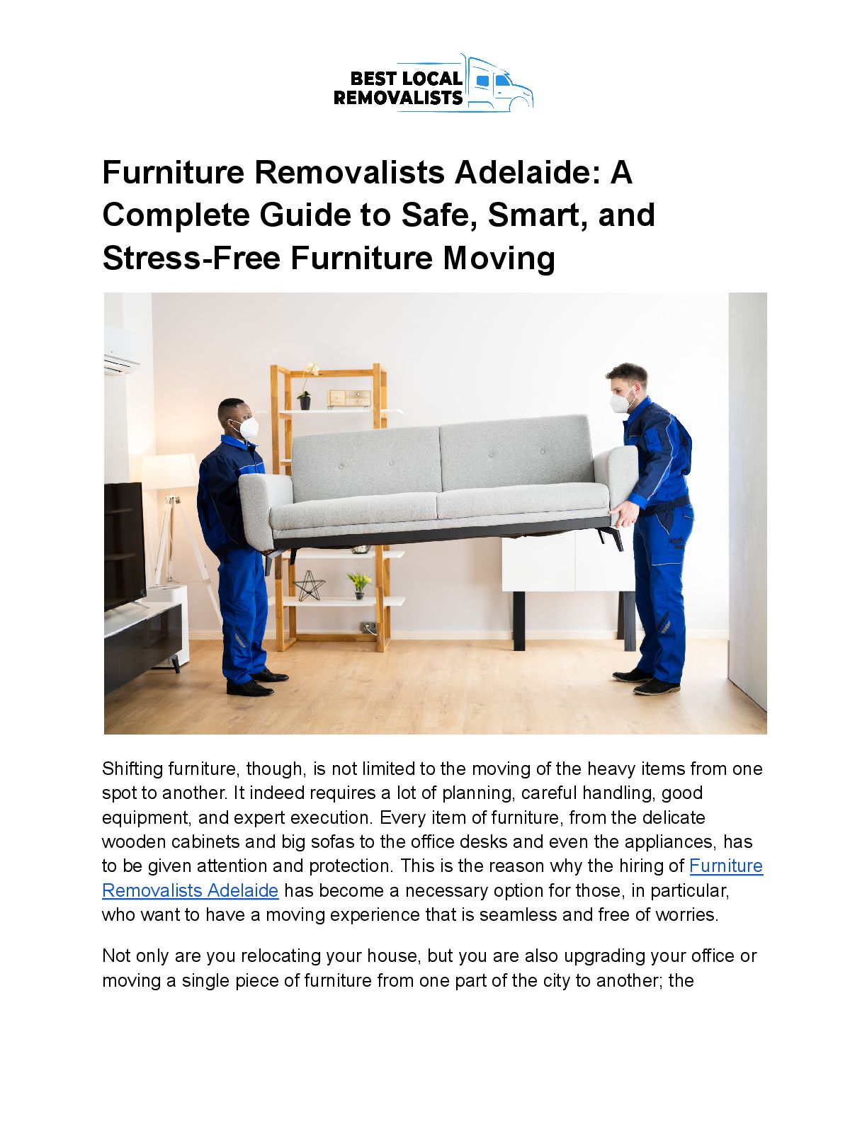 Moving furniture doesn’t have to be hard. This PDF guide breaks down how furniture removalists in Adelaide safely pack, lift, and transport your items. It’s an easy-to-read resource for homeowners and businesses looking for reliable, damage-free furniture moving solutions across Adelaide.