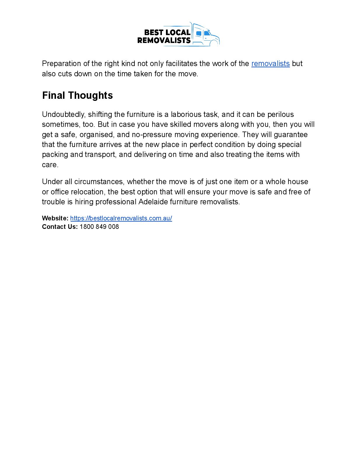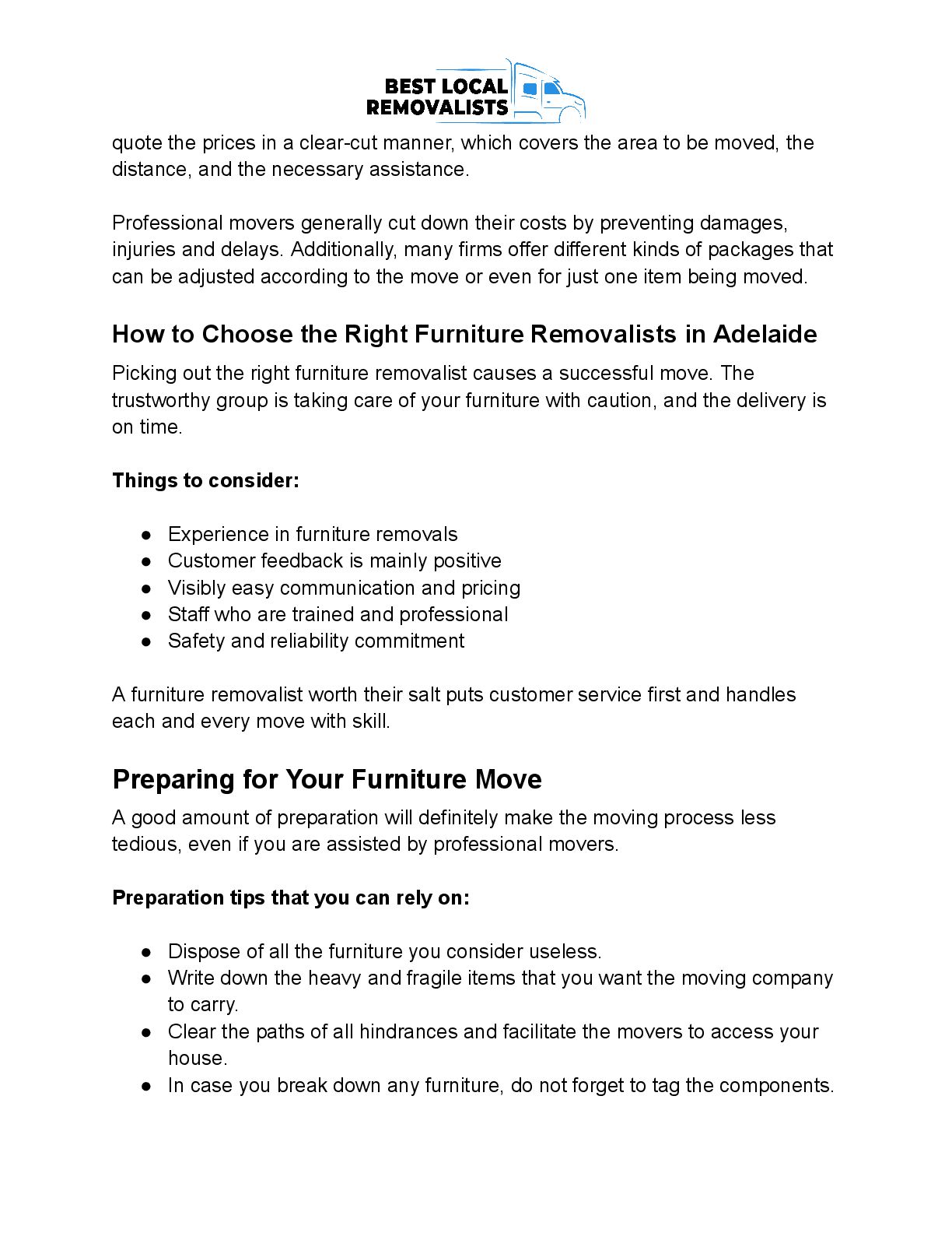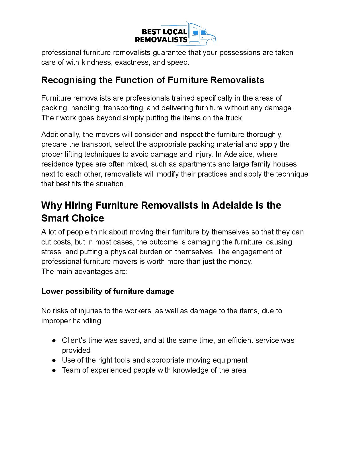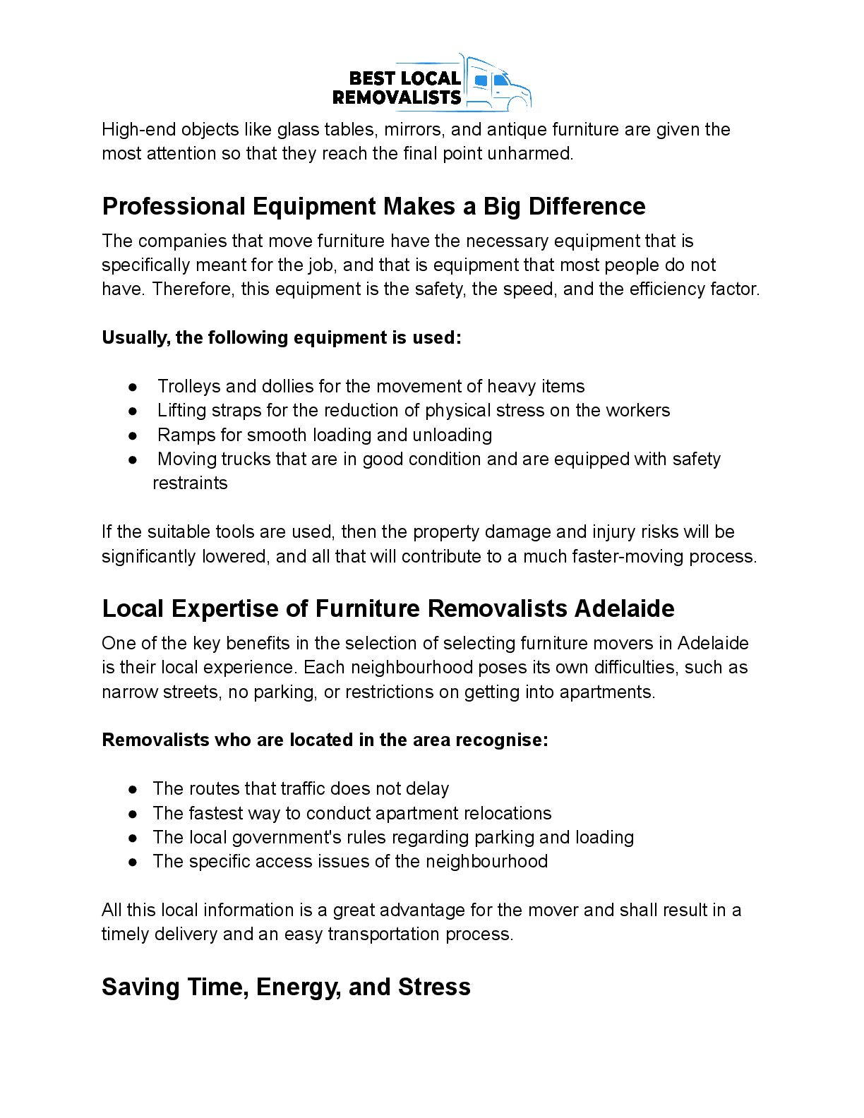 Moving furniture doesn’t have to be hard. This PDF guide breaks down how furniture removalists in Adelaide safely pack, lift, and transport your items. It’s an easy-to-read resource for homeowners and businesses looking for reliable, damage-free furniture moving solutions across Adelaide.
