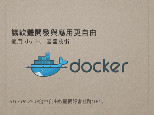 讓軟體開發與應⽤用更更⾃自由 使⽤用 docker 容器技術 2017.06.25 @台中⾃自由軟體愛好者社群(TFC)