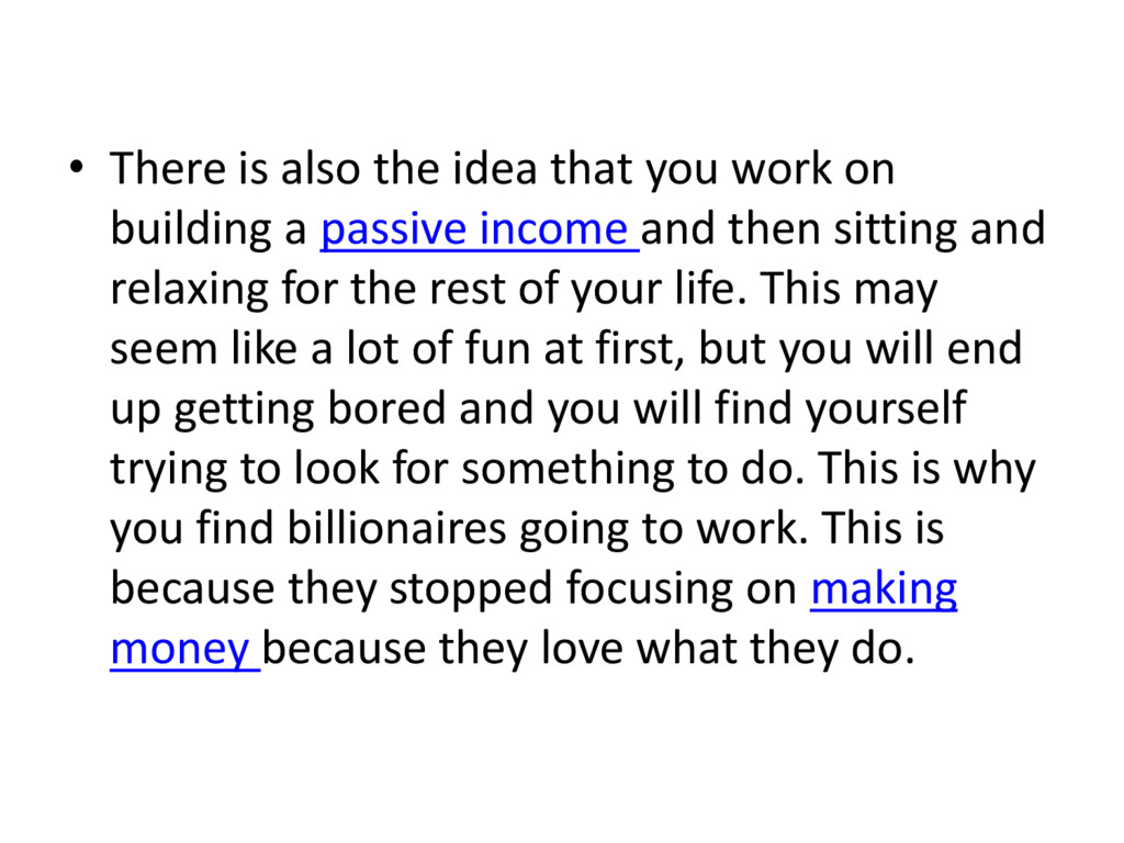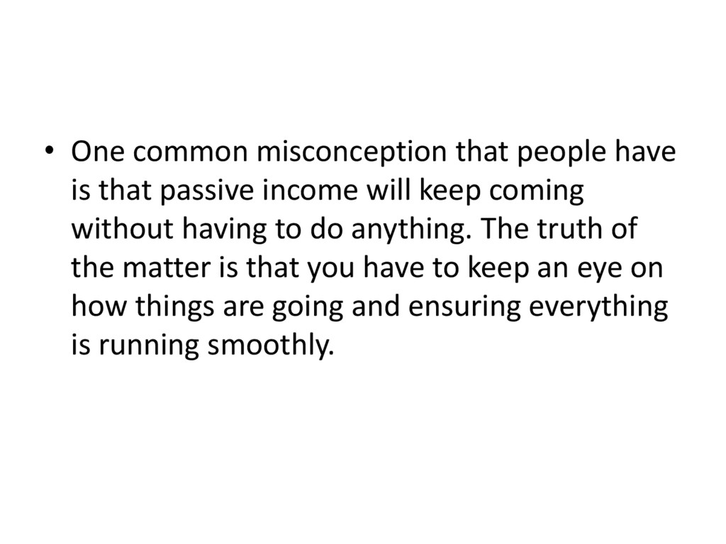 One common misconception that people have is that passive income will keep coming without having to do anything. The truth of the matter is that you have to keep an eye on how things are going and ensuring everything is running smoothly. There is also the idea that you work on building a passive income and then sitting and relaxing for the rest of your life. This may seem like a lot of fun at first, but you will end up getting bored and you will find yourself trying to look for something to do. This is why you find billionaires going to work. This is because they stopped focusing on making money because they love what they do.