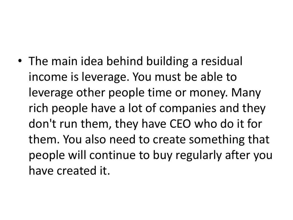The main idea behind building a residual income is leverage. You must be able to leverage other people time or money. Many rich people have a lot of companies and they don't run them, they have CEO who do it for them. You also need to create something that people will continue to buy regularly after you have created it.