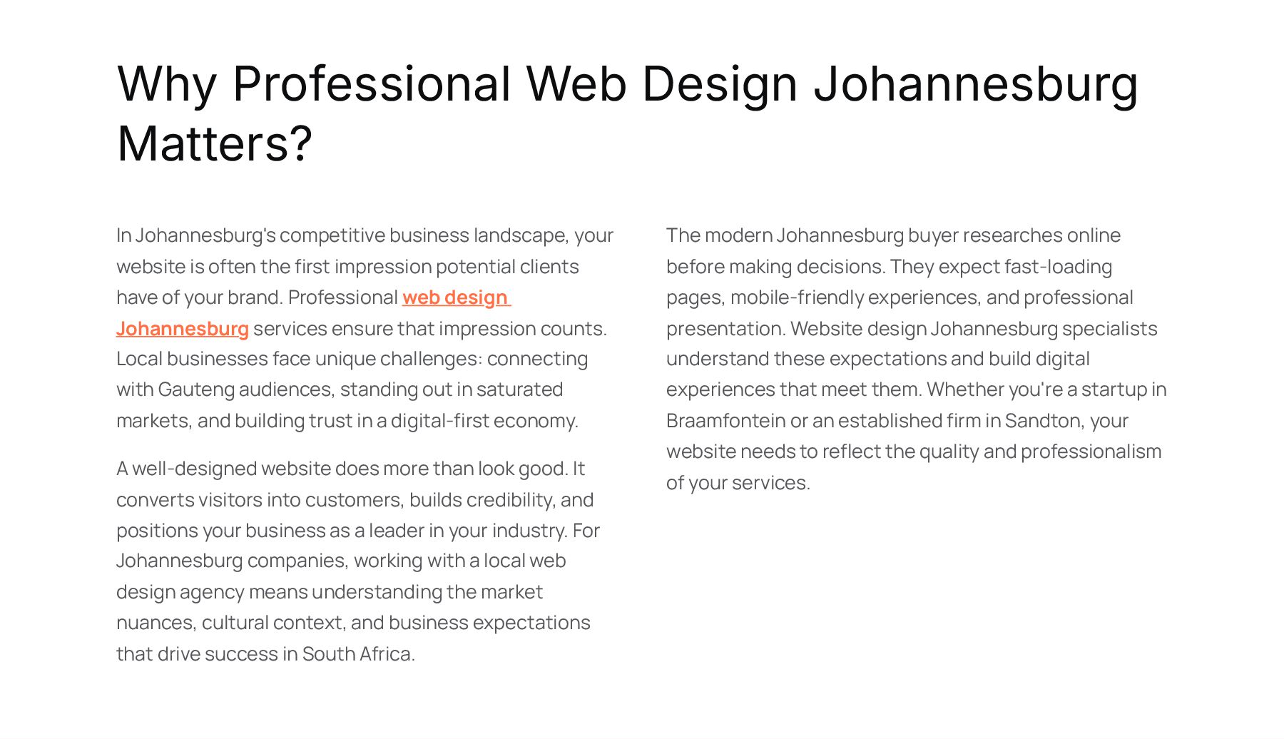 landscape, your website is often the first impression potential clients have of your brand. Professional web design Johannesburg services ensure that impression counts. Local businesses face unique challenges: connecting with Gauteng audiences, standing out in saturated markets, and building trust in a digital-first economy. A well-designed website does more than look good. It converts visitors into customers, builds credibility, and positions your business as a leader in your industry. For Johannesburg companies, working with a local web design agency means understanding the market nuances, cultural context, and business expectations that drive success in South Africa. The modern Johannesburg buyer researches online before making decisions. They expect fast-loading pages, mobile-friendly experiences, and professional presentation. Website design Johannesburg specialists understand these expectations and build digital experiences that meet them. Whether you're a startup in Braamfontein or an established firm in Sandton, your website needs to reflect the quality and professionalism of your services.