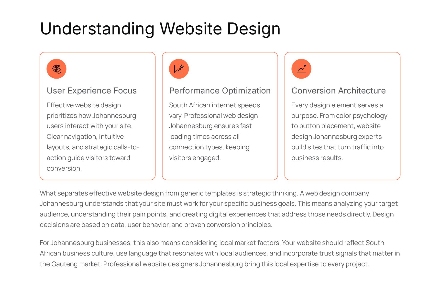 how Johannesburg users interact with your site. Clear navigation, intuitive layouts, and strategic calls-to- action guide visitors toward conversion. Performance Optimization South African internet speeds vary. Professional web design Johannesburg ensures fast loading times across all connection types, keeping visitors engaged. Conversion Architecture Every design element serves a purpose. From color psychology to button placement, website design Johannesburg experts build sites that turn traffic into business results. What separates effective website design from generic templates is strategic thinking. A web design company Johannesburg understands that your site must work for your specific business goals. This means analyzing your target audience, understanding their pain points, and creating digital experiences that address those needs directly. Design decisions are based on data, user behavior, and proven conversion principles. For Johannesburg businesses, this also means considering local market factors. Your website should reflect South African business culture, use language that resonates with local audiences, and incorporate trust signals that matter in the Gauteng market. Professional website designers Johannesburg bring this local expertise to every project.