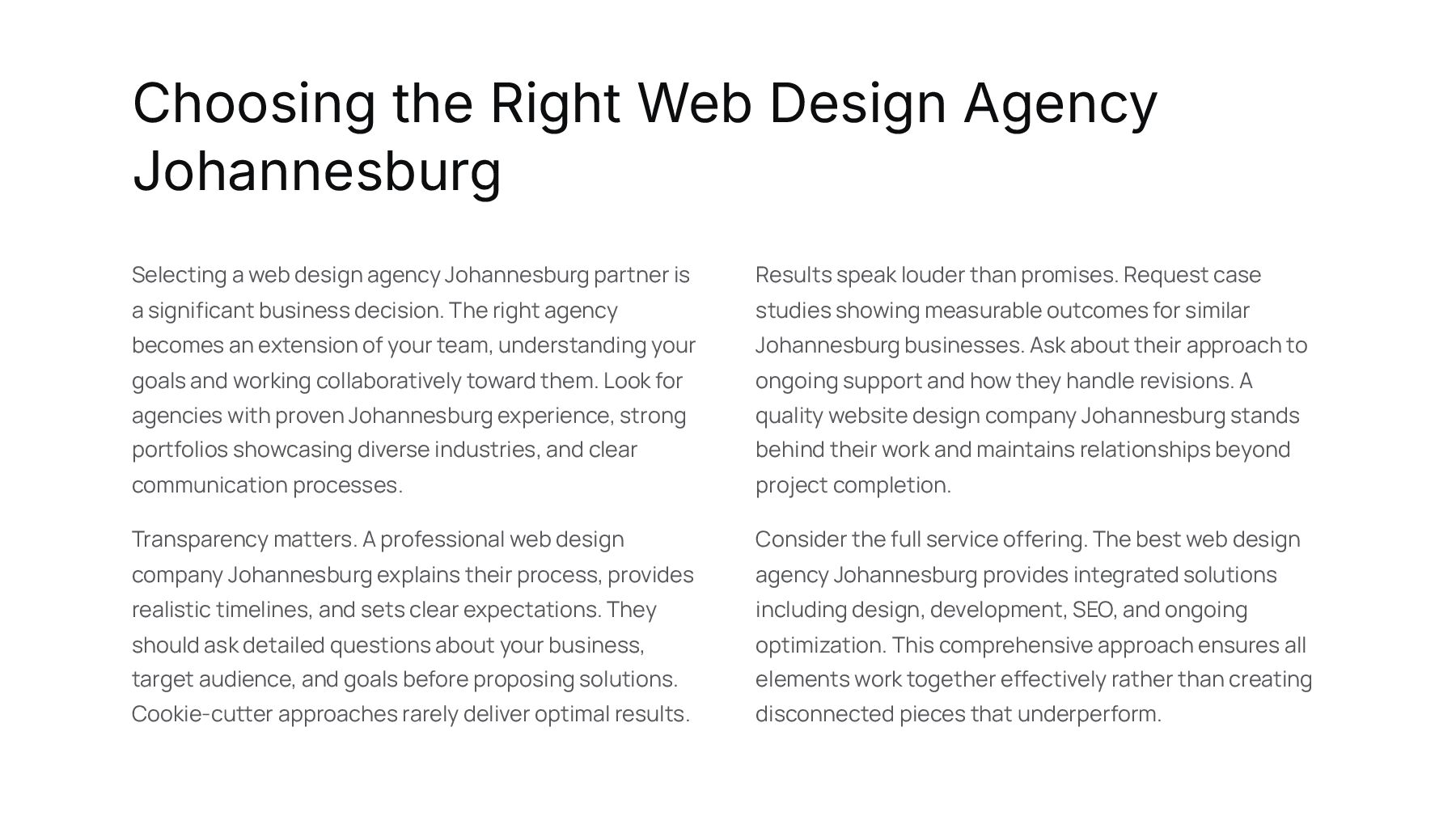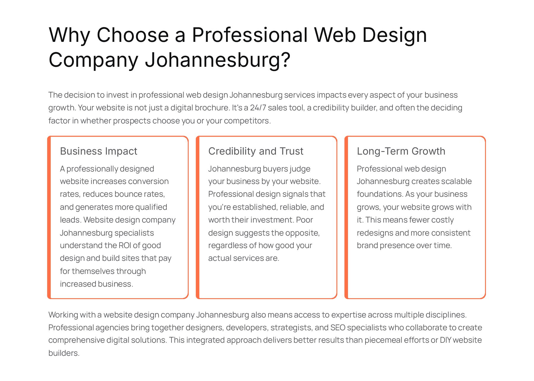 to invest in professional web design Johannesburg services impacts every aspect of your business growth. Your website is not just a digital brochure. It's a 24/7 sales tool, a credibility builder, and often the deciding factor in whether prospects choose you or your competitors. Business Impact A professionally designed website increases conversion rates, reduces bounce rates, and generates more qualified leads. Website design company Johannesburg specialists understand the ROI of good design and build sites that pay for themselves through increased business. Credibility and Trust Johannesburg buyers judge your business by your website. Professional design signals that you're established, reliable, and worth their investment. Poor design suggests the opposite, regardless of how good your actual services are. Long-Term Growth Professional web design Johannesburg creates scalable foundations. As your business grows, your website grows with it. This means fewer costly redesigns and more consistent brand presence over time. Working with a website design company Johannesburg also means access to expertise across multiple disciplines. Professional agencies bring together designers, developers, strategists, and SEO specialists who collaborate to create comprehensive digital solutions. This integrated approach delivers better results than piecemeal efforts or DIY website builders.