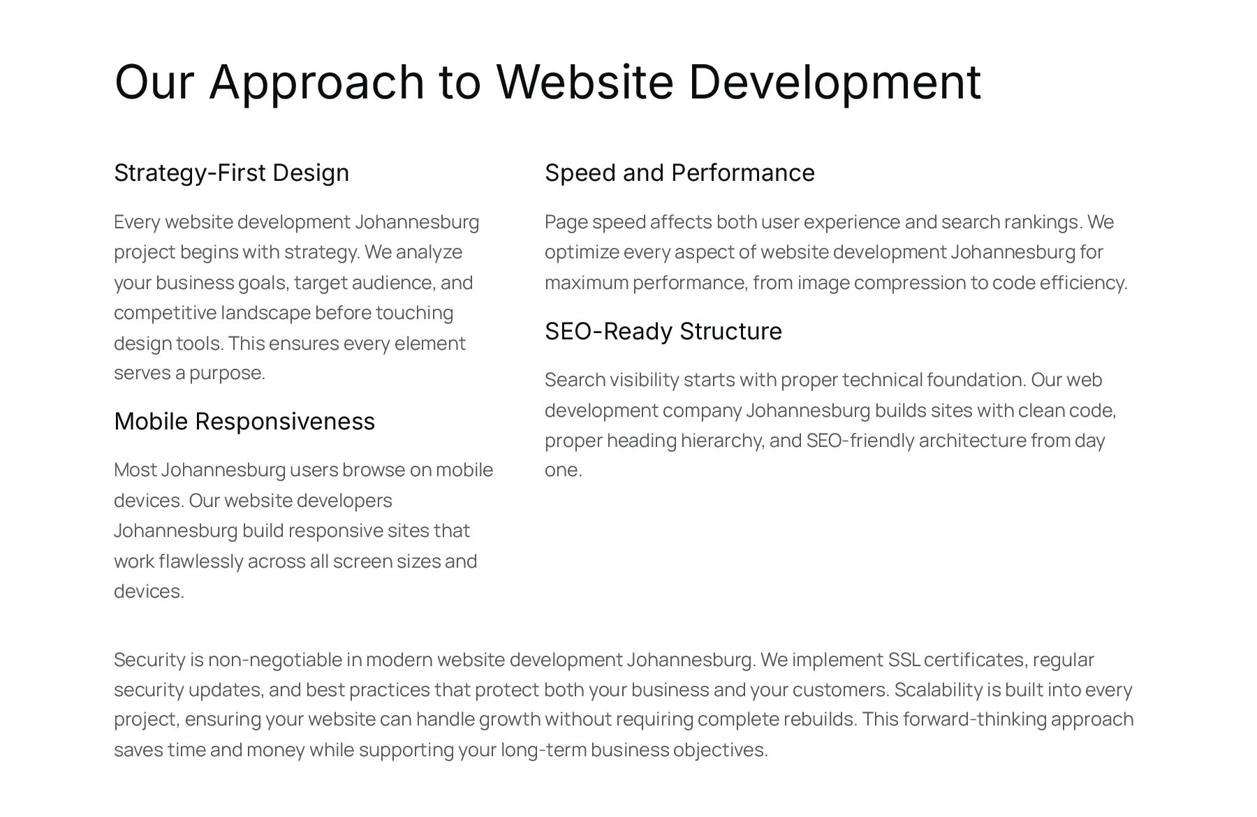 Johannesburg project begins with strategy. We analyze your business goals, target audience, and competitive landscape before touching design tools. This ensures every element serves a purpose. Mobile Responsiveness Most Johannesburg users browse on mobile devices. Our website developers Johannesburg build responsive sites that work flawlessly across all screen sizes and devices. Speed and Performance Page speed affects both user experience and search rankings. We optimize every aspect of website development Johannesburg for maximum performance, from image compression to code efficiency. SEO-Ready Structure Search visibility starts with proper technical foundation. Our web development company Johannesburg builds sites with clean code, proper heading hierarchy, and SEO-friendly architecture from day one. Security is non-negotiable in modern website development Johannesburg. We implement SSL certificates, regular security updates, and best practices that protect both your business and your customers. Scalability is built into every project, ensuring your website can handle growth without requiring complete rebuilds. This forward-thinking approach saves time and money while supporting your long-term business objectives.