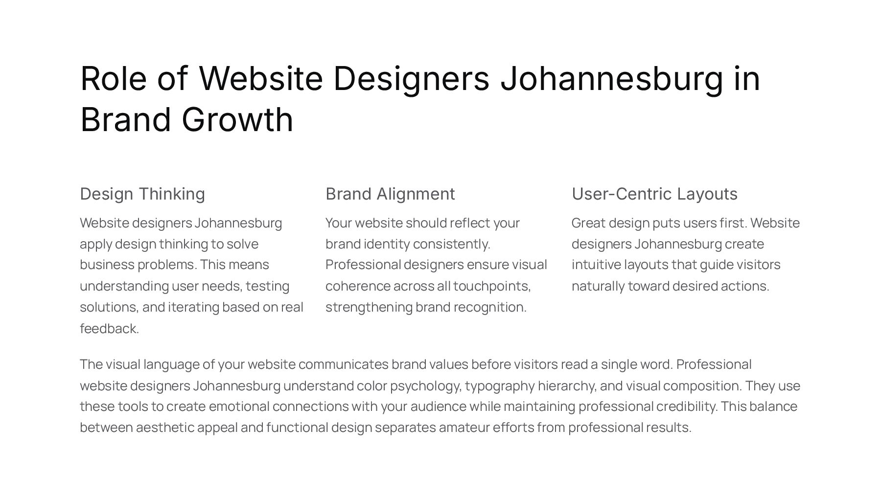 Website designers Johannesburg apply design thinking to solve business problems. This means understanding user needs, testing solutions, and iterating based on real feedback. Brand Alignment Your website should reflect your brand identity consistently. Professional designers ensure visual coherence across all touchpoints, strengthening brand recognition. User-Centric Layouts Great design puts users first. Website designers Johannesburg create intuitive layouts that guide visitors naturally toward desired actions. The visual language of your website communicates brand values before visitors read a single word. Professional website designers Johannesburg understand color psychology, typography hierarchy, and visual composition. They use these tools to create emotional connections with your audience while maintaining professional credibility. This balance between aesthetic appeal and functional design separates amateur efforts from professional results.