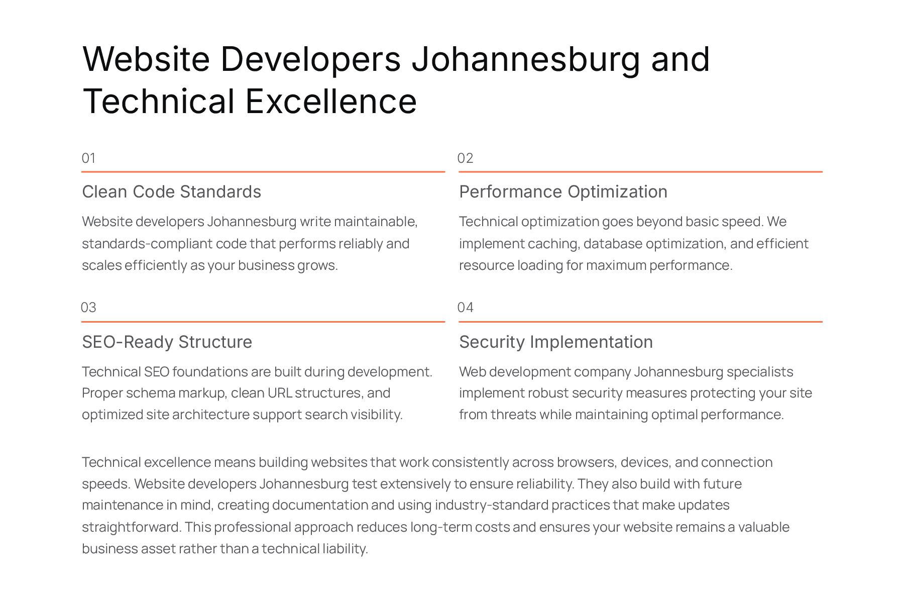 Website developers Johannesburg write maintainable, standards-compliant code that performs reliably and scales efficiently as your business grows. 02 Performance Optimization Technical optimization goes beyond basic speed. We implement caching, database optimization, and efficient resource loading for maximum performance. 03 SEO-Ready Structure Technical SEO foundations are built during development. Proper schema markup, clean URL structures, and optimized site architecture support search visibility. 04 Security Implementation Web development company Johannesburg specialists implement robust security measures protecting your site from threats while maintaining optimal performance. Technical excellence means building websites that work consistently across browsers, devices, and connection speeds. Website developers Johannesburg test extensively to ensure reliability. They also build with future maintenance in mind, creating documentation and using industry-standard practices that make updates straightforward. This professional approach reduces long-term costs and ensures your website remains a valuable business asset rather than a technical liability.