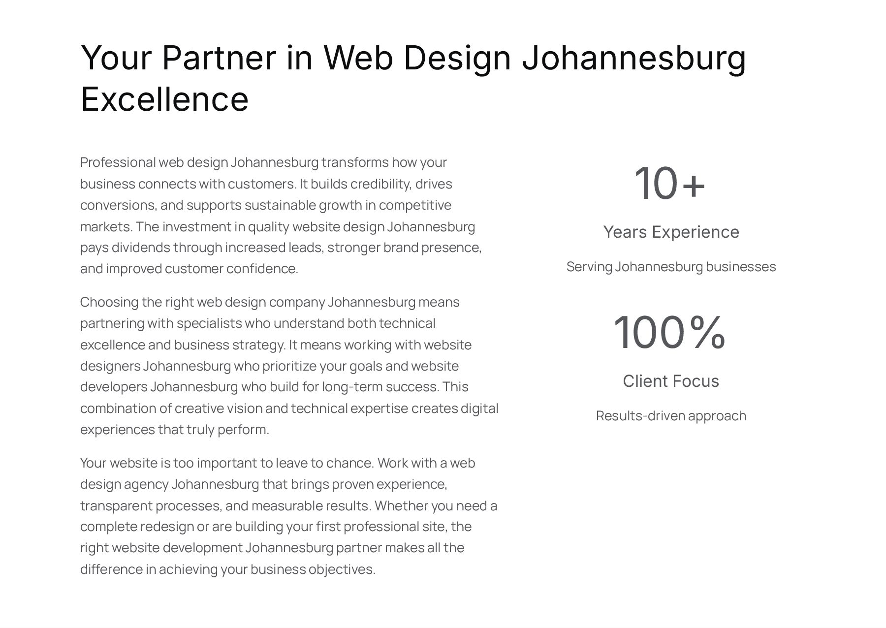 Johannesburg transforms how your business connects with customers. It builds credibility, drives conversions, and supports sustainable growth in competitive markets. The investment in quality website design Johannesburg pays dividends through increased leads, stronger brand presence, and improved customer confidence. Choosing the right web design company Johannesburg means partnering with specialists who understand both technical excellence and business strategy. It means working with website designers Johannesburg who prioritize your goals and website developers Johannesburg who build for long-term success. This combination of creative vision and technical expertise creates digital experiences that truly perform. Your website is too important to leave to chance. Work with a web design agency Johannesburg that brings proven experience, transparent processes, and measurable results. Whether you need a complete redesign or are building your first professional site, the right website development Johannesburg partner makes all the difference in achieving your business objectives. 10+ Years Experience Serving Johannesburg businesses 100% Client Focus Results-driven approach