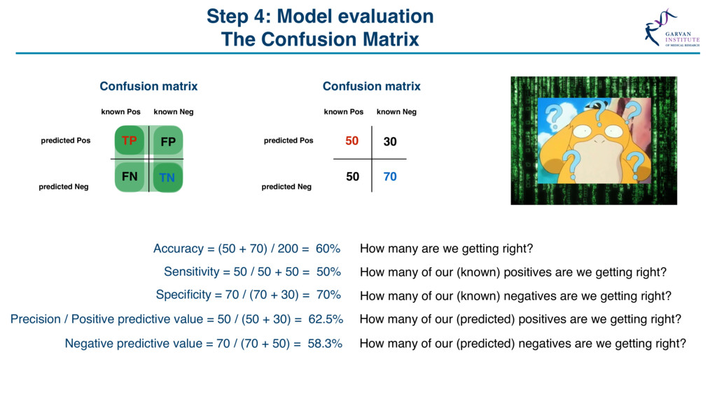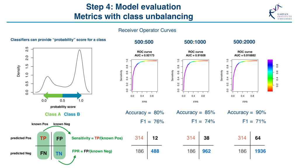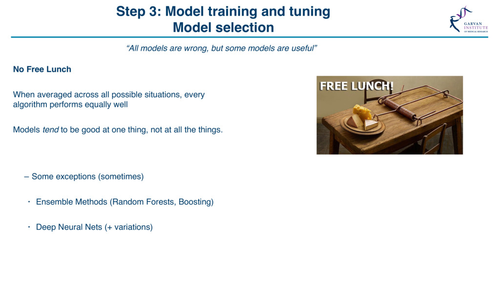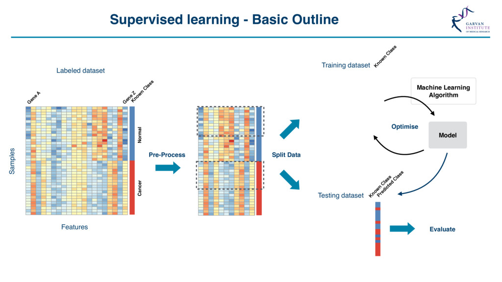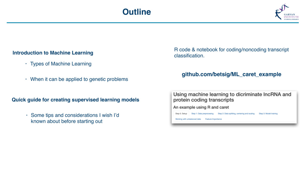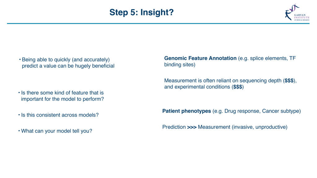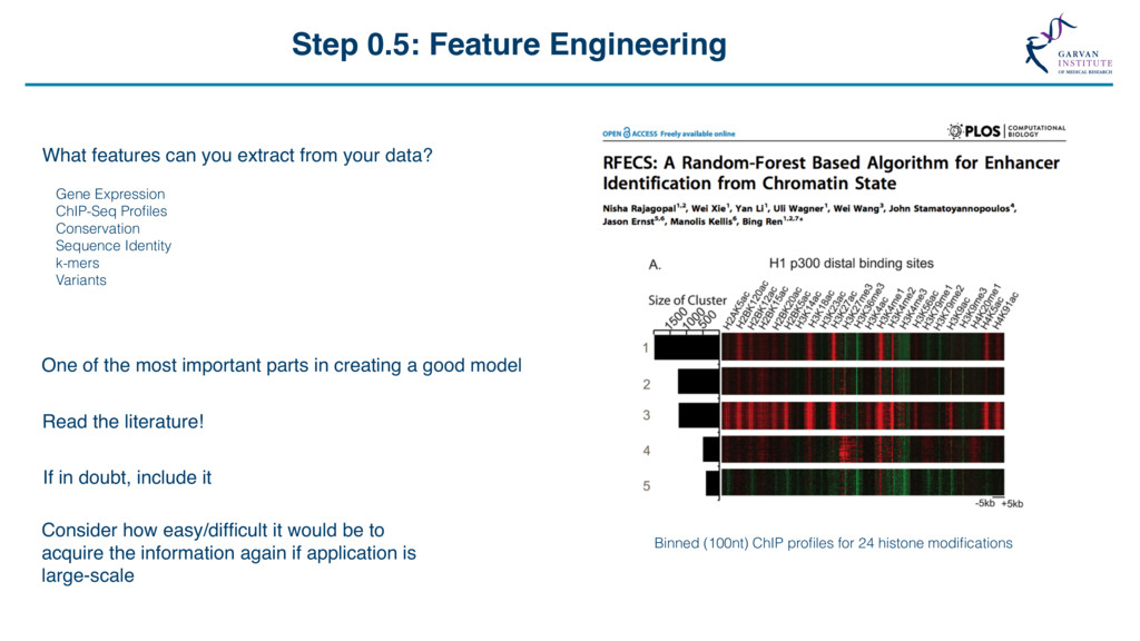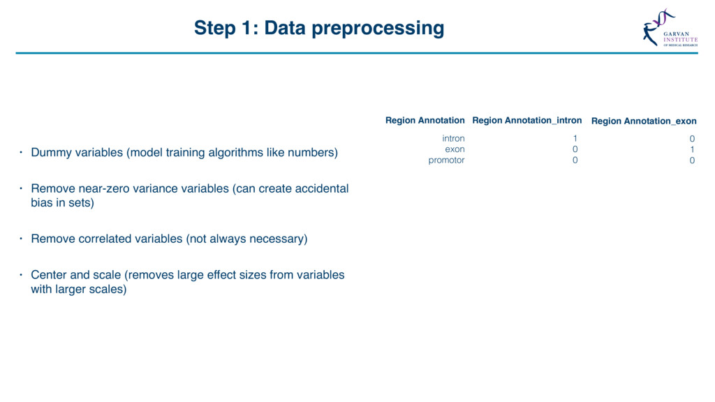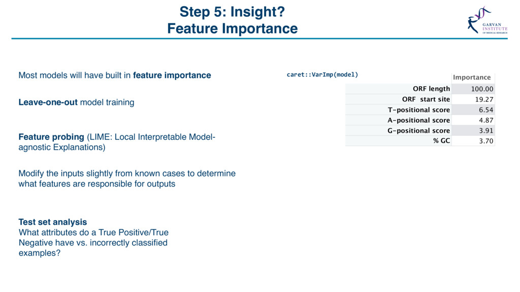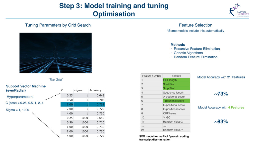 Grid Search “The Grid” Support Vector Machine (svmRadial) Hyperparameters C (cost) = 0.25, 0.5, 1, 2, 4 Sigma = 1, 1000 C sigma Accuracy 0.25 1 0.649 0.50 1 0.708 1.00 1 0.732 2.00 1 0.729 4.00 1 0.730 0.25 1000 0.649 0.50 1000 0.710 1.00 1000 0.730 2.00 1000 0.730 4.00 1000 0.727 Feature Selection *Some models include this automatically Feature number Feature 1 ORF length 2 Start Site 3 Stop Site 4 Sequence length 5 A-positional score 6 T-positional score 7 C-positional score 8 G-positional score 8 ORF frame 10 % GC 11 Random Value X … … 21 Random Value Y Model Accuracy with 21 Features Model Accuracy with 4 Features ~73% SVM model for lncRNA / protein coding transcript discrimination Methods • Recursive Feature Elimination • Genetic Algorithms • Random Feature Elimination ~83% Feature number Feature 1 ORF length 2 Start Site 3 Stop Site 4 Sequence length 5 A-positional score 6 T-positional score 7 C-positional score 8 G-positional score 8 ORF frame 10 % GC 11 Random Value X … … 21 Random Value Y
