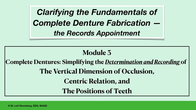 4 — Simplifying the Determination and Recording of the Vertical Dimension of Occlusion, Centric Relation, and Positions of the Teeth 1. Re fi ne the contours of the esthetic wax rim as a guide for the teeth positions. 2. No one method for determining the vertical dimension of occlusion (VDO) will be best for all patients. It is advisable to use several methods and compare the results, including speech, rest position, facial proportions, and evaluation of the VDO of the old dentures. 3. Centric relation (CR) can be accurately located with a gothic arch tracer if the patient does not have TM disorder. 4. The gothic arch tracer can accurately record VDO and CR for restorations for edentulous patients.