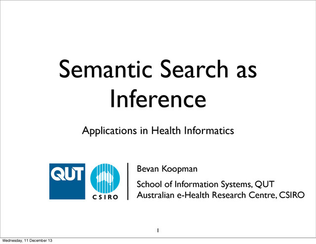 as inference: • Integration of structured domain knowledge (ontologies) with • Statistical, information retrieval methods Provides the necessary mechanism for inference For effective semantic search of medical data. Leveraging inference and semantics to infer relevant information. Wednesday, 11 December 13