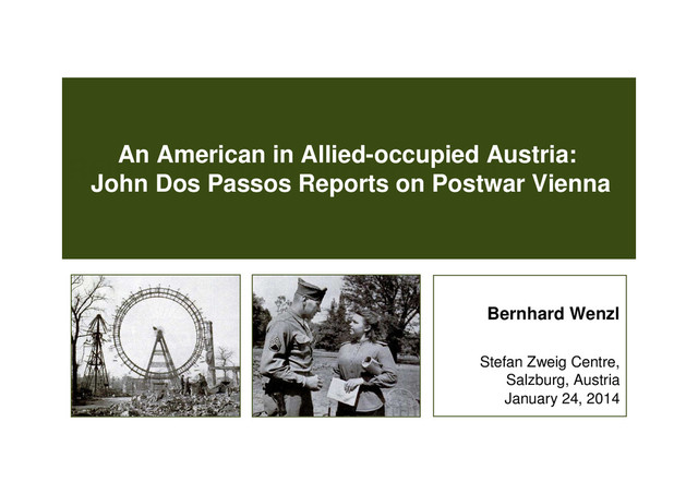 The report that John Dos Passos wrote about Vienna reflects his cross-cultural encounters in Allied-occupied Austria. Published in the March 4, 1946 issue of LIFE magazine and in Tour of Duty of August 1946, it presents the Viennese as victimized by Nazi butcheries and Soviet brutalities who welcomed their American liberators. Its ideological bias is conveyed by the author’s use of literary images and political rhetoric well known to American readers, ranging from the (inverted) frontier myth, to the image of Vienna as a home to music and theater, and the stereotype of the crude and evil Bolshevik. Analyzing and interpreting Dos Passos’s report from a cultural studies’ perspective sheds light on America’s relationship with Austria in the early Post-World War II years.