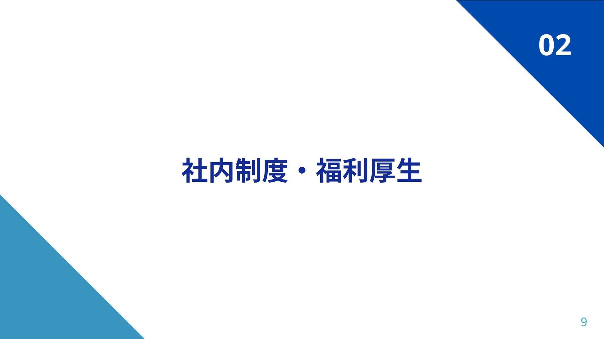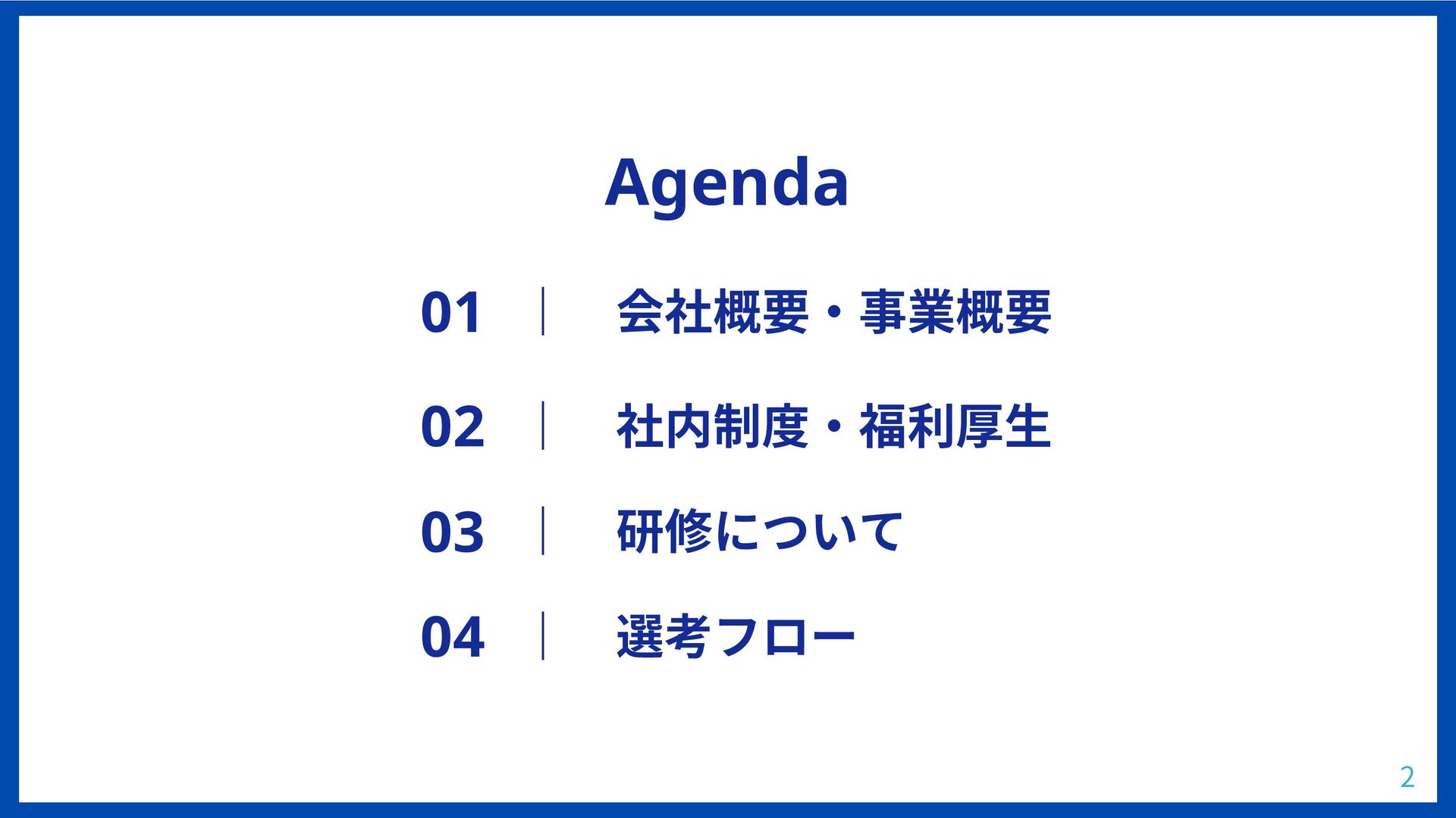 Agenda | 会社概要・事業概要 | 社内制度・福利厚生 | 研修について 01 02 03 04 | 選考フロー 2
