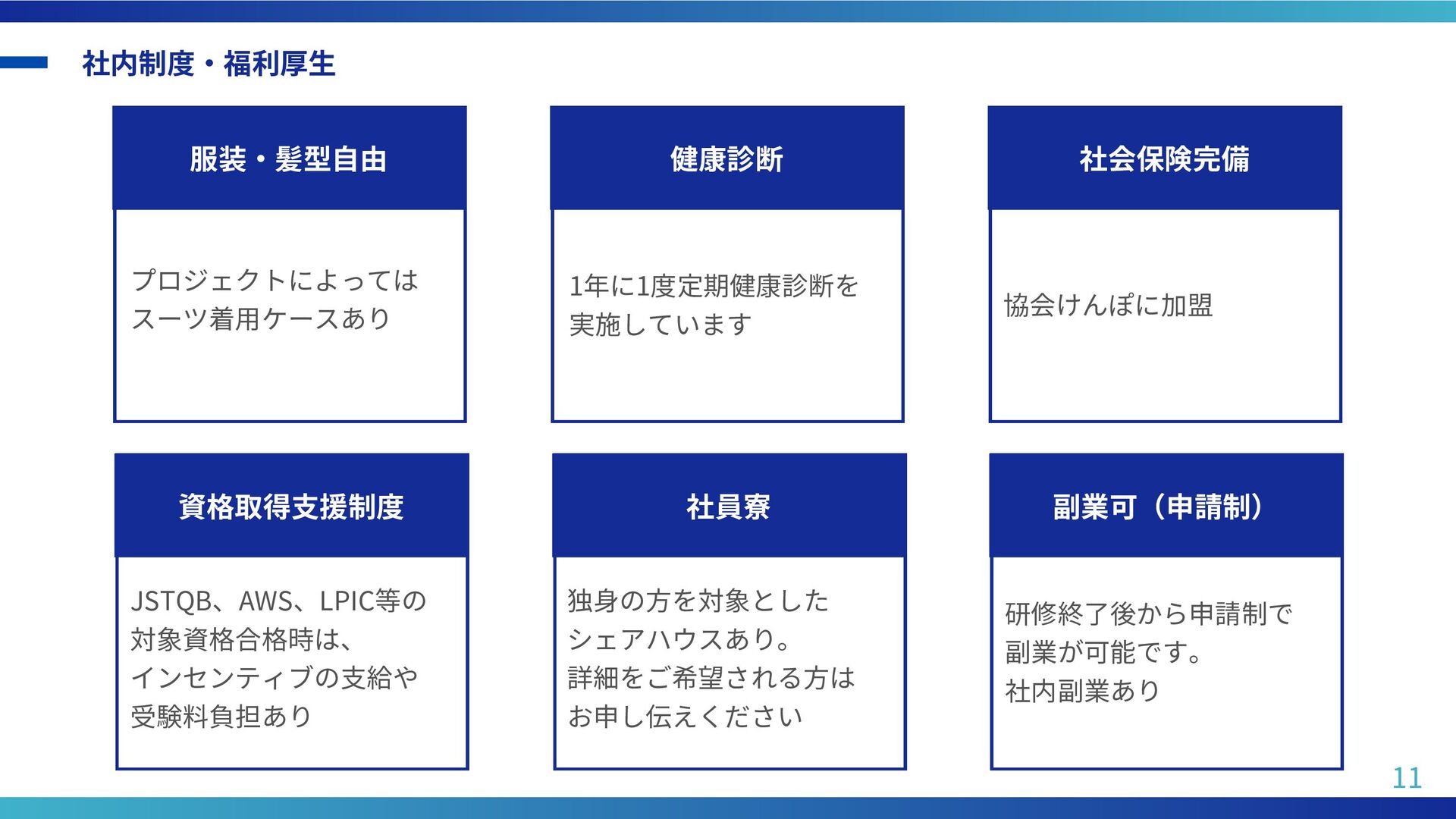 健康診断 1年に1度定期健康診断を 実施しています 社内制度・福利厚生 資格取得支援制度 JSTQB、AWS、LPIC等の 対象資格合格時は、 インセンティブの支給や 受験料負担あり 服装・髪型自由