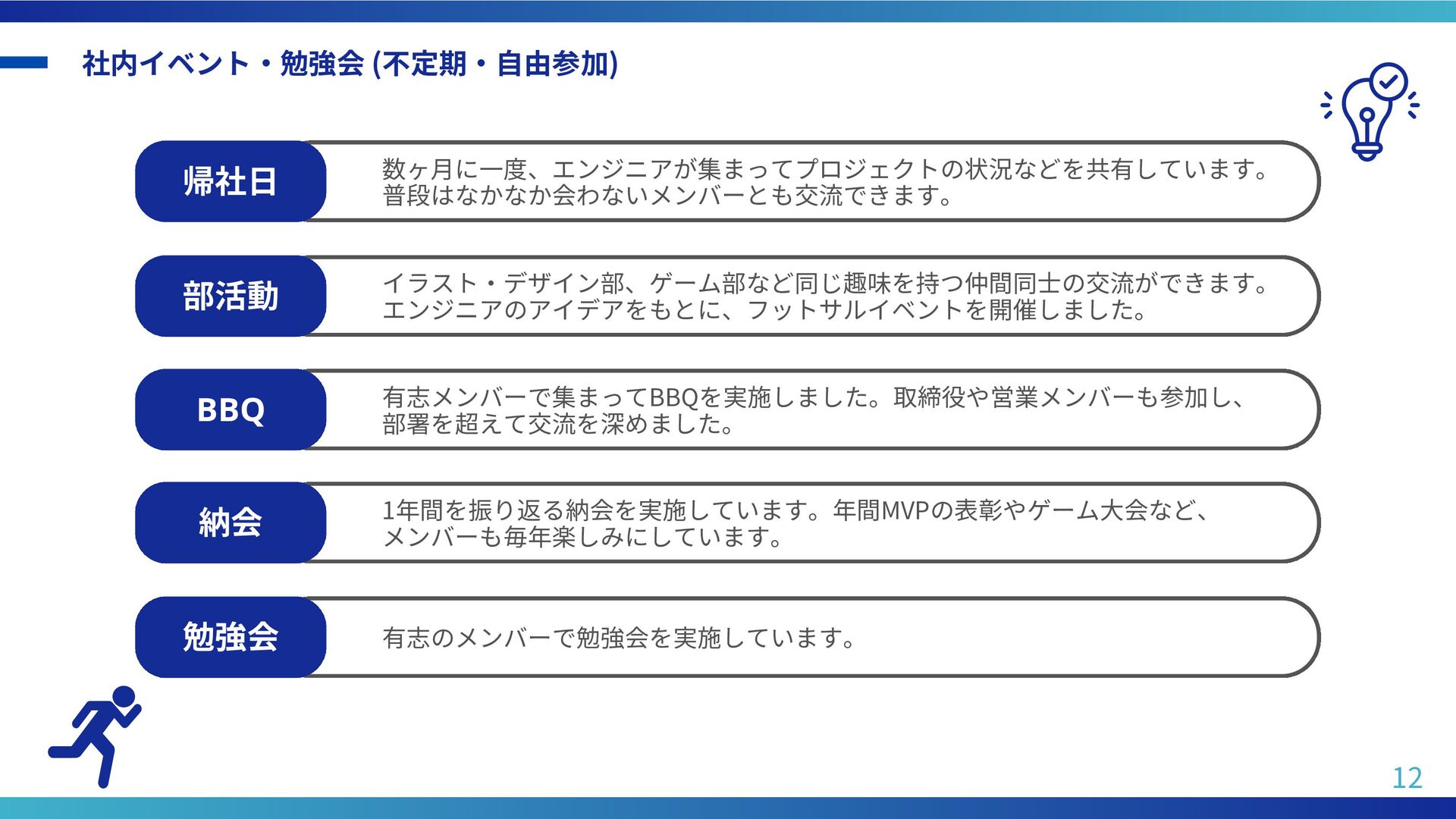 BBQ 1年間を振り返る納会を実施しています。年間MVPの表彰やゲーム大会など、 メンバーも毎年楽しみにしています。 納会 有志のメンバーで勉強会を実施しています。 勉強会 12