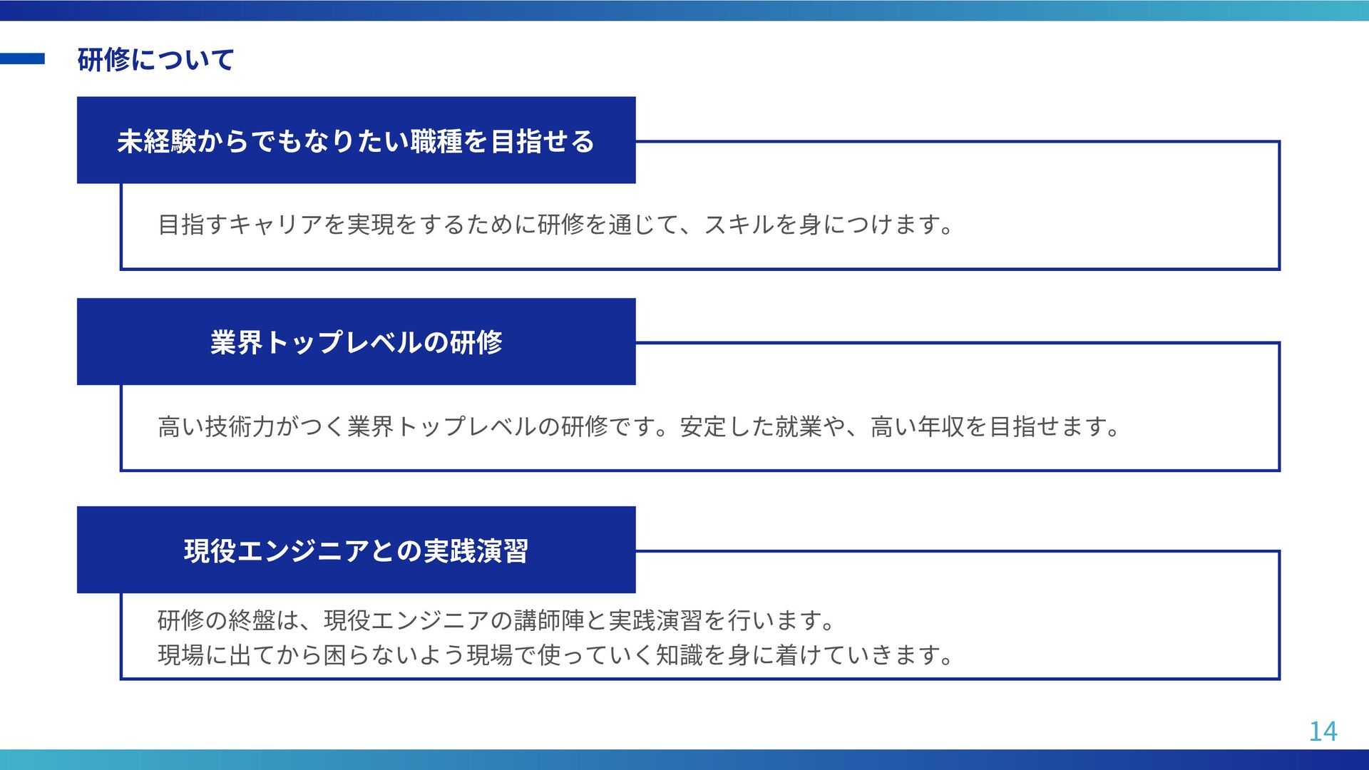 未経験からでもなりたい職種を目指せる 目指すキャリアを実現をするために研修を通じて、スキルを身につけます。 研修について 業界トップレベルの研修 高い技術力がつく業界トップレベルの研修です。安定した就業や、高い年収を目指せます。 現役エンジニアとの実践演習 研修の終盤は、現役エンジニアの講師陣と実践演習を行います。 現場に出てから困らないよう現場で使っていく知識を身に着けていきます。 14