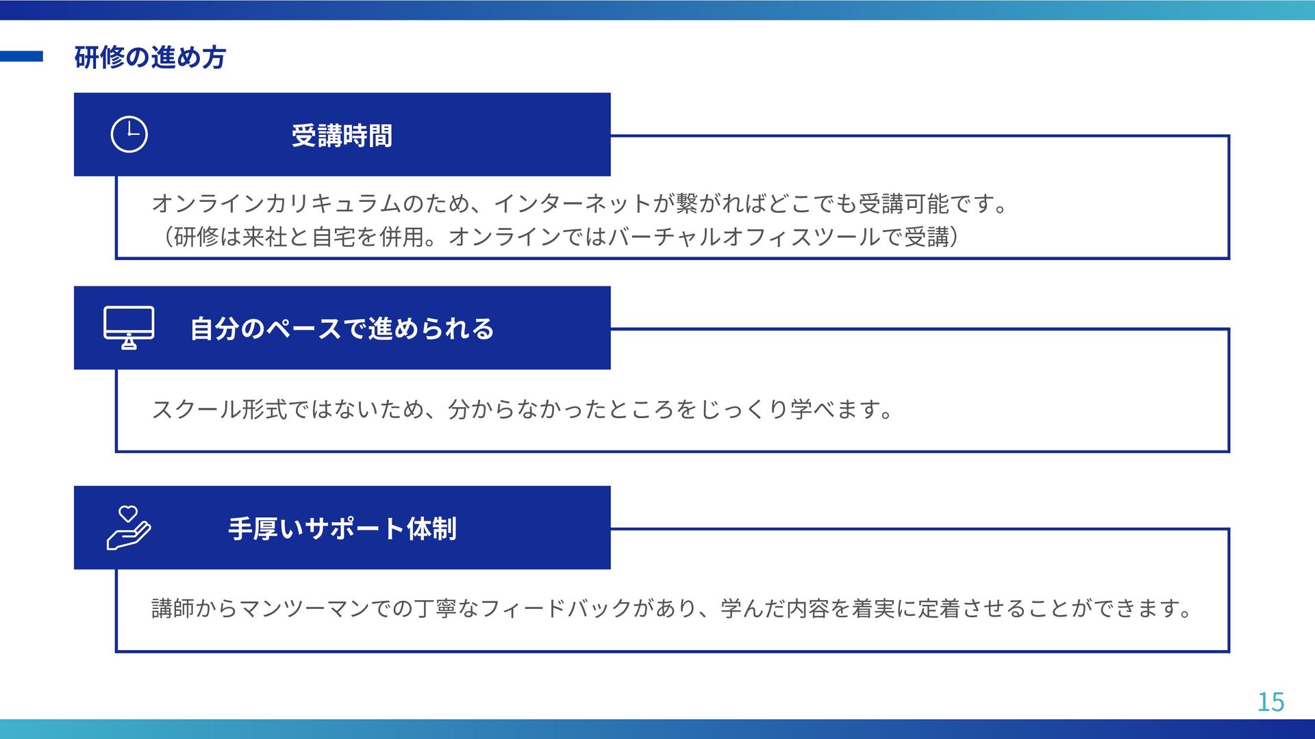 受講時間 オンラインカリキュラムのため、インターネットが繋がればどこでも受講可能です。 (研修は来社と自宅を併用。オンラインではバーチャルオフィスツールで受講) 自分のペースで進められる スクール形式ではないため、分からなかったところをじっくり学べます。 手厚いサポート体制 講師からマンツーマンでの丁寧なフィードバックがあり、学んだ内容を着実に定着させることができます。 研修の進め方 15