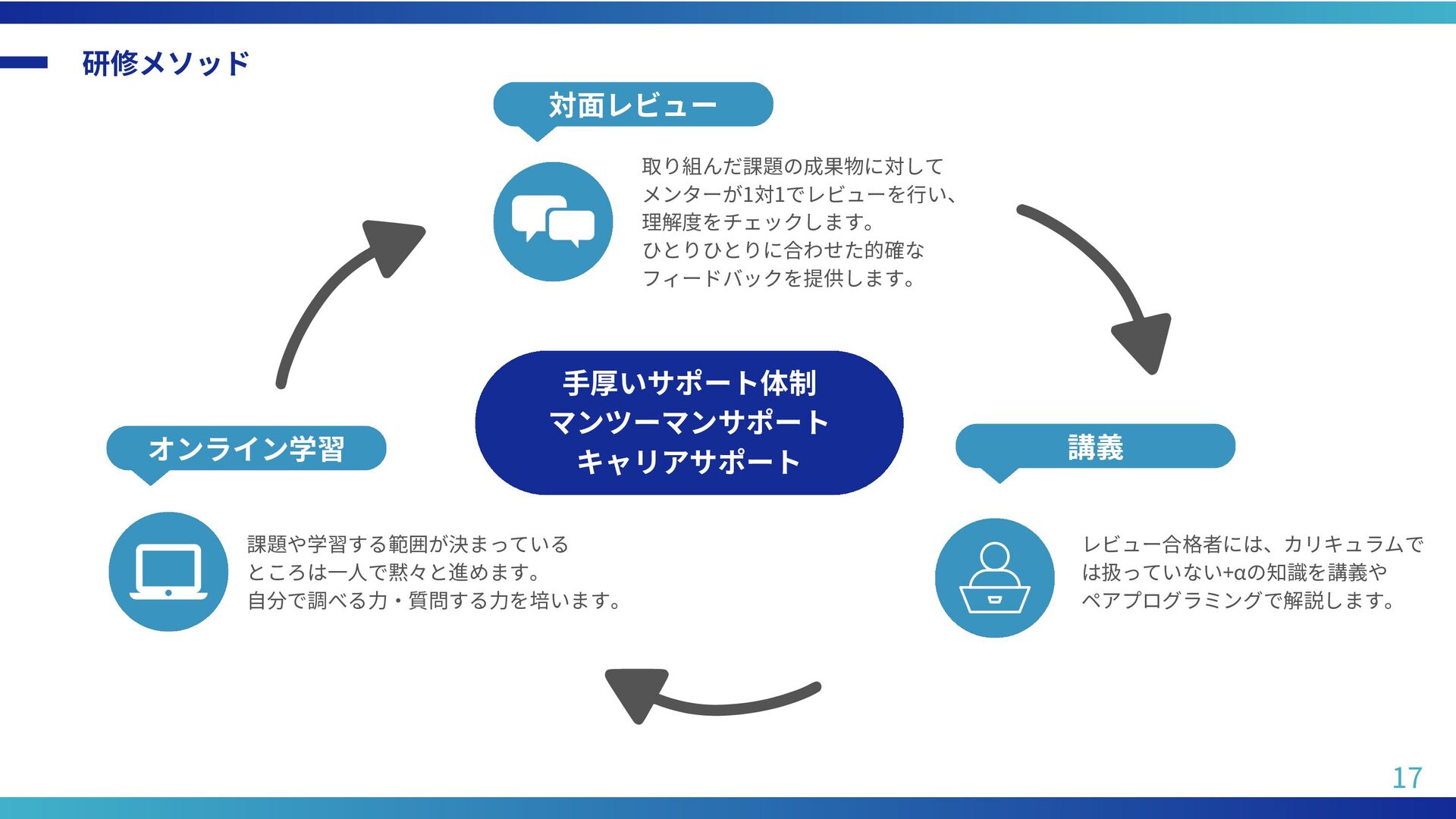 オンライン学習 課題や学習する範囲が決まっている ところは一人で黙々と進めます。 自分で調べる力・質問する力を培います。 対面レビュー 講義 手厚いサポート体制 マンツーマンサポート キャリアサポート 研修メソッド