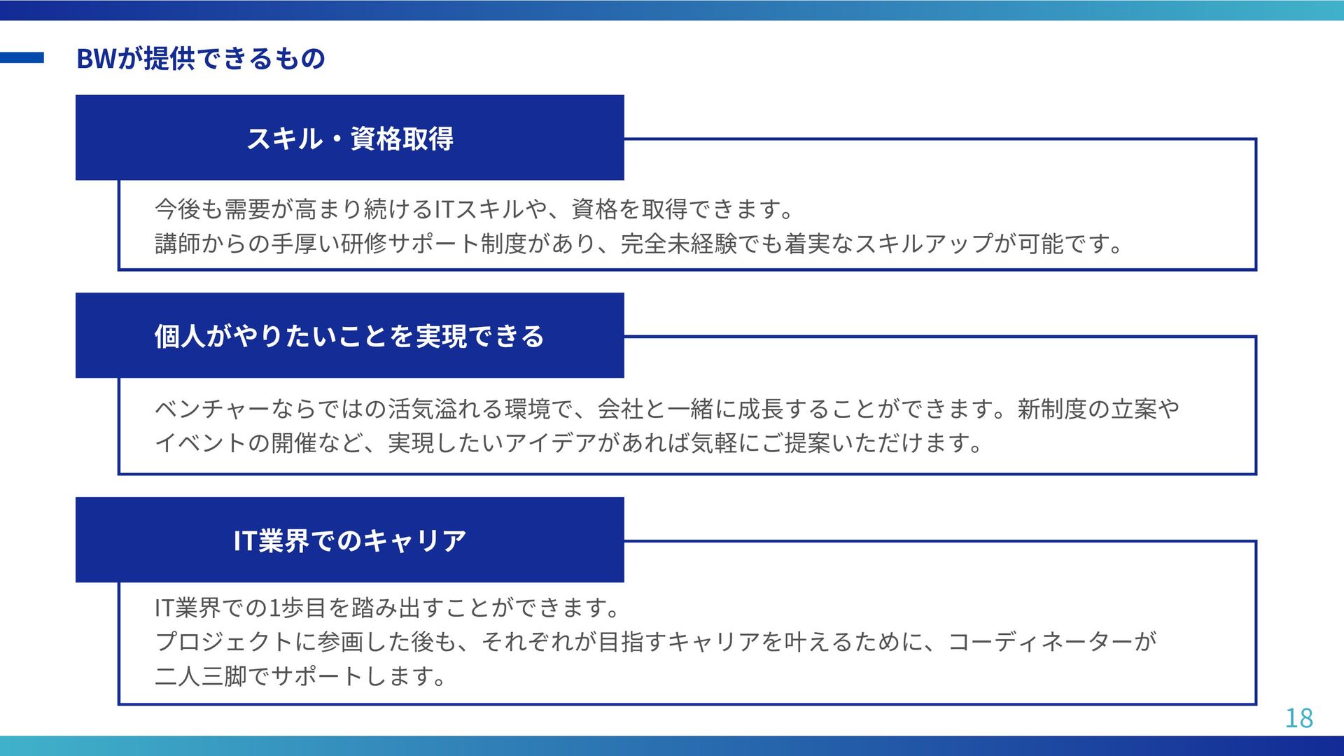 スキル・資格取得 今後も需要が高まり続けるITスキルや、資格を取得できます。 講師からの手厚い研修サポート制度があり、完全未経験でも着実なスキルアップが可能です。 個人がやりたいことを実現できる ベンチャーならではの活気溢れる環境で、会社と一緒に成長することができます。新制度の立案や イベントの開催など、実現したいアイデアがあれば気軽にご提案いただけます。 IT業界でのキャリア IT業界での1歩目を踏み出すことができます。 プロジェクトに参画した後も、それぞれが目指すキャリアを叶えるために、コーディネーターが 二人三脚でサポートします。