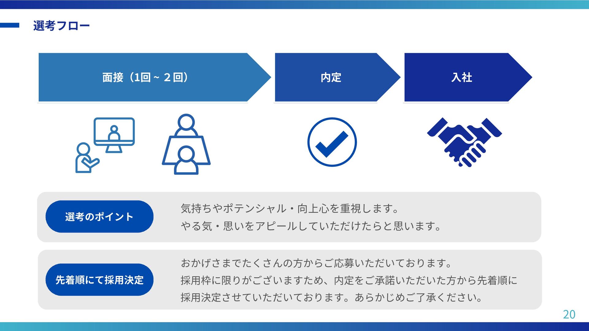 おかげさまでたくさんの方からご応募いただいております。 採用枠に限りがございますため、内定をご承諾いただいた方から先着順に 採用決定させていただいております。あらかじめご了承ください。 先着順にて採用決定 20