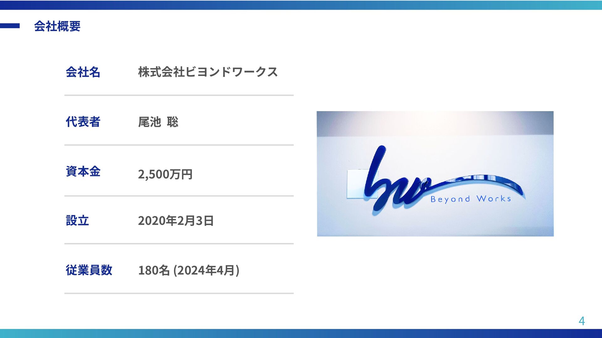 会社名 代表者 資本金 設立 従業員数 株式会社ビヨンドワークス 尾池 聡 尾池 聡