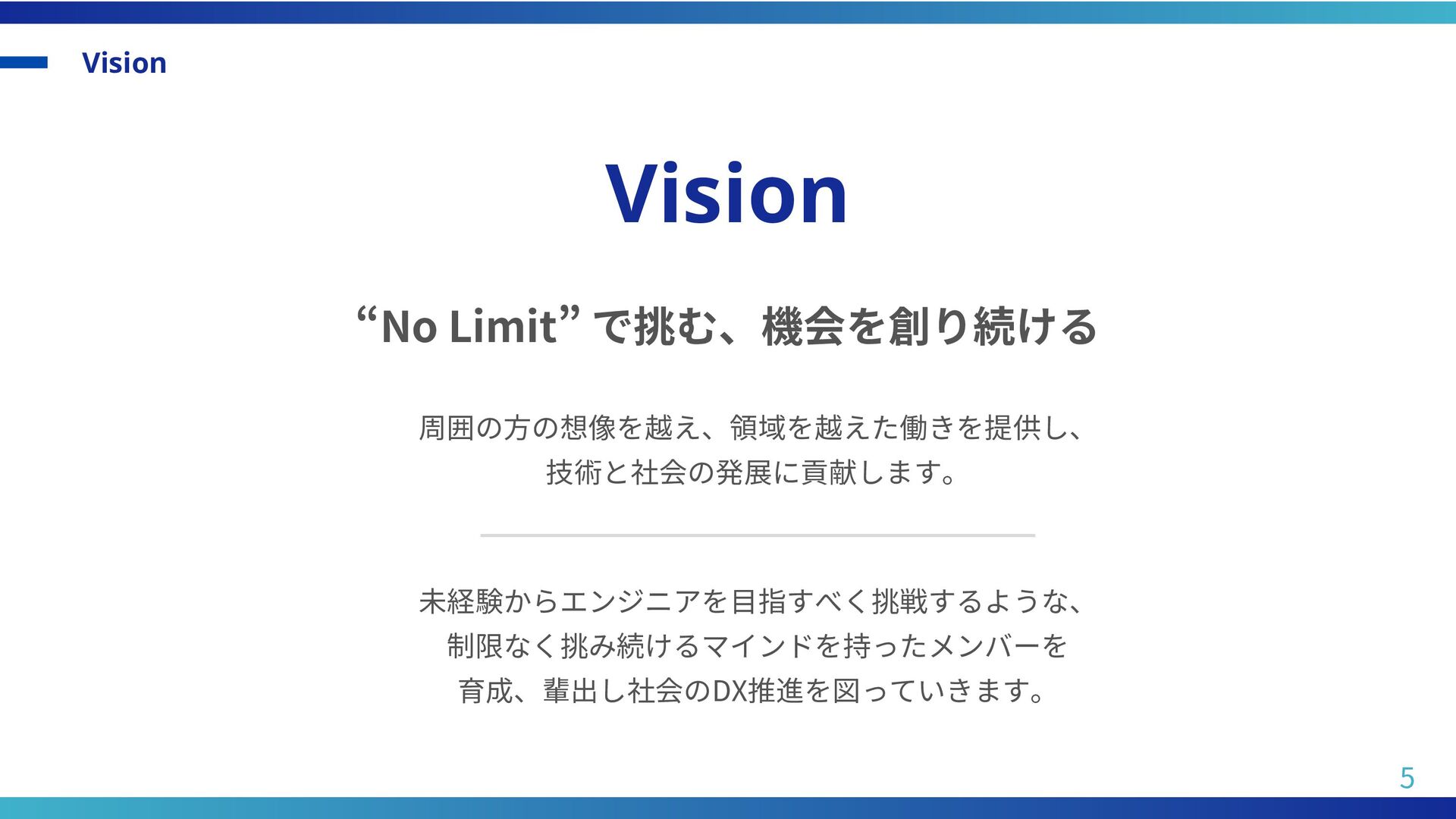 Vision Vision “No Limit” で挑む、機会を創り続ける 周囲の方の想像を越え、領域を越えた働きを提供し、 技術と社会の発展に貢献します。 未経験からエンジニアを目指すべく挑戦するような、 制限なく挑み続けるマインドを持ったメンバーを 育成、輩出し社会のDX推進を図っていきます。