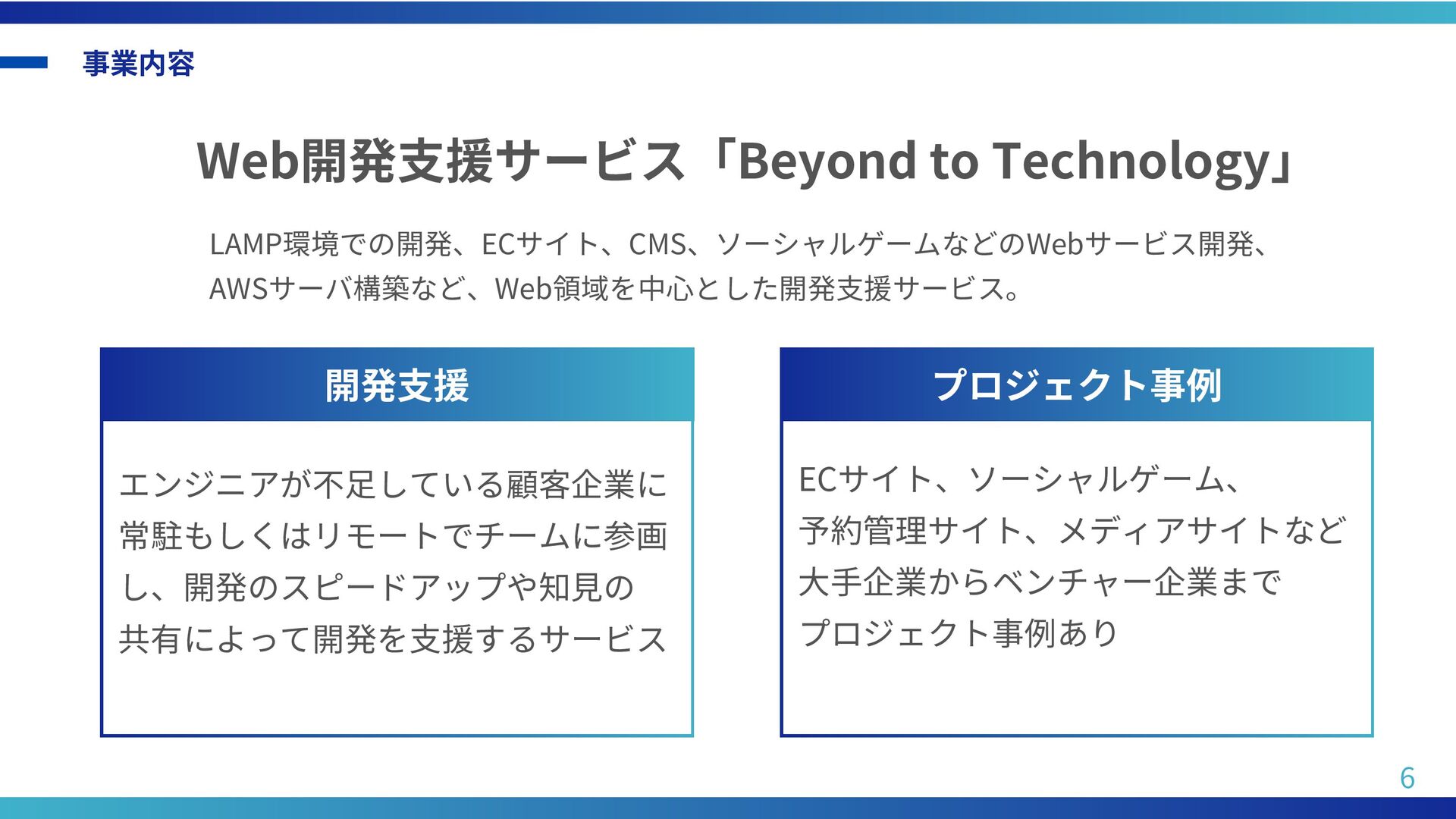 開発支援 事業内容 エンジニアが不足している顧客企業に 常駐もしくはリモートでチームに参画 し、開発のスピードアップや知見の 共有によって開発を支援するサービス Web開発支援サービス「Beyond to Technology」 プロジェクト事例