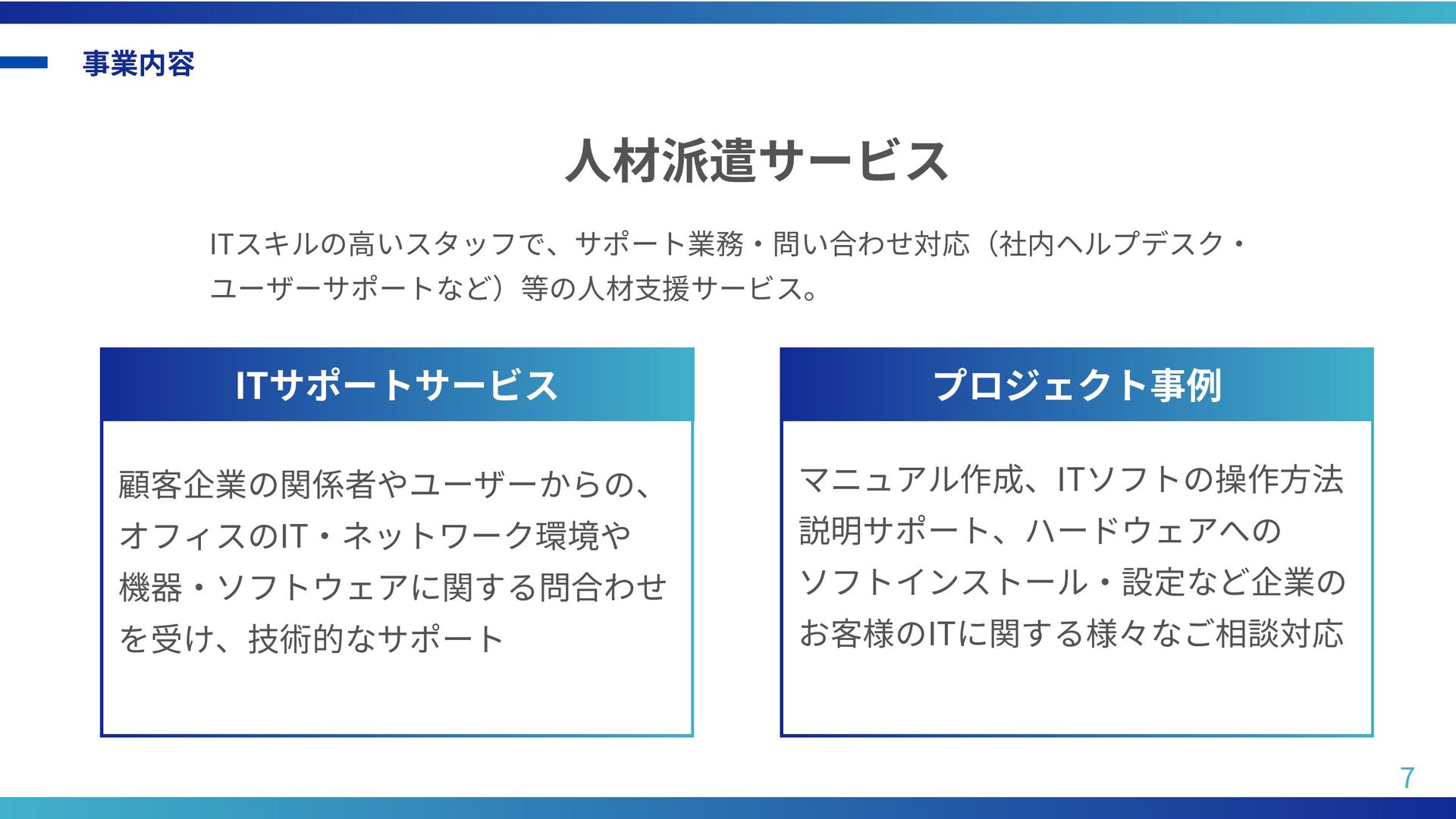 ITサポートサービス 事業内容 顧客企業の関係者やユーザーからの、 オフィスのIT・ネットワーク環境や 機器・ソフトウェアに関する問合わせ を受け、技術的なサポート 人材派遣サービス プロジェクト事例 マニュアル作成、ITソフトの操作方法 説明サポート、ハードウェアへの